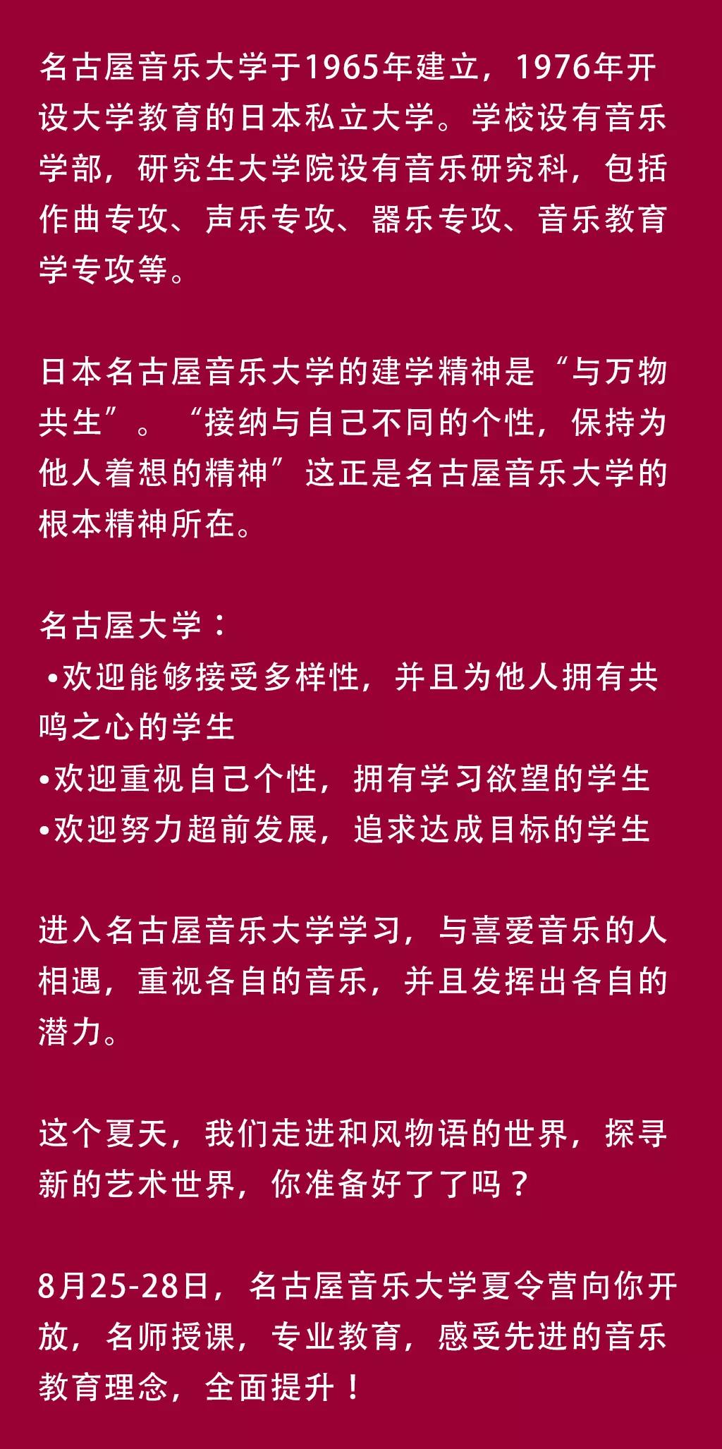 为了拓展学生的国际视野,了解国外音乐教育,感受不同文化的碰撞,借此次签约之际,与名古屋音乐大学合作举办夏季学院,所授课程经过双方精心探讨。经学院同意,此次研修可认定为人才培养方案中一学期的实践学分,并在评定奖学金时如遇同等条件有国外研修经历的将优先对待。