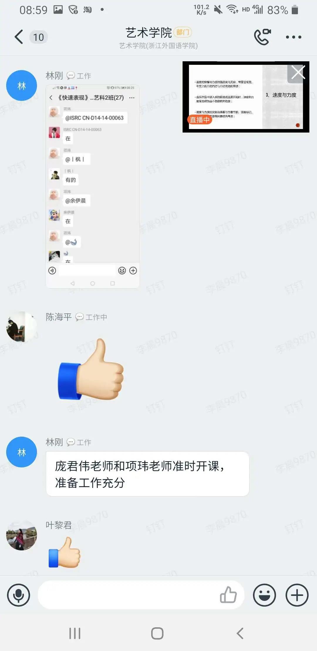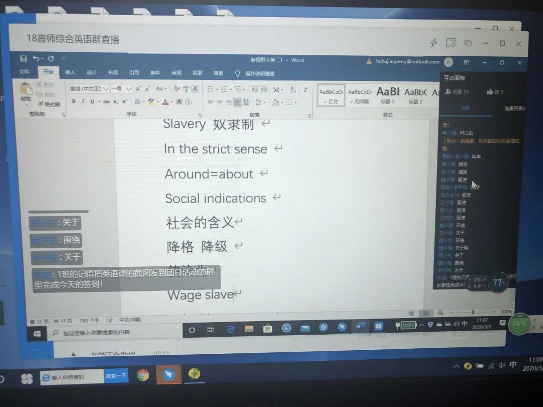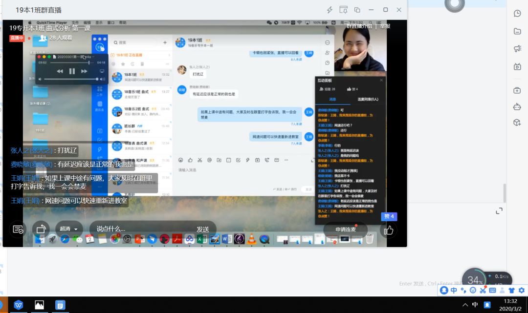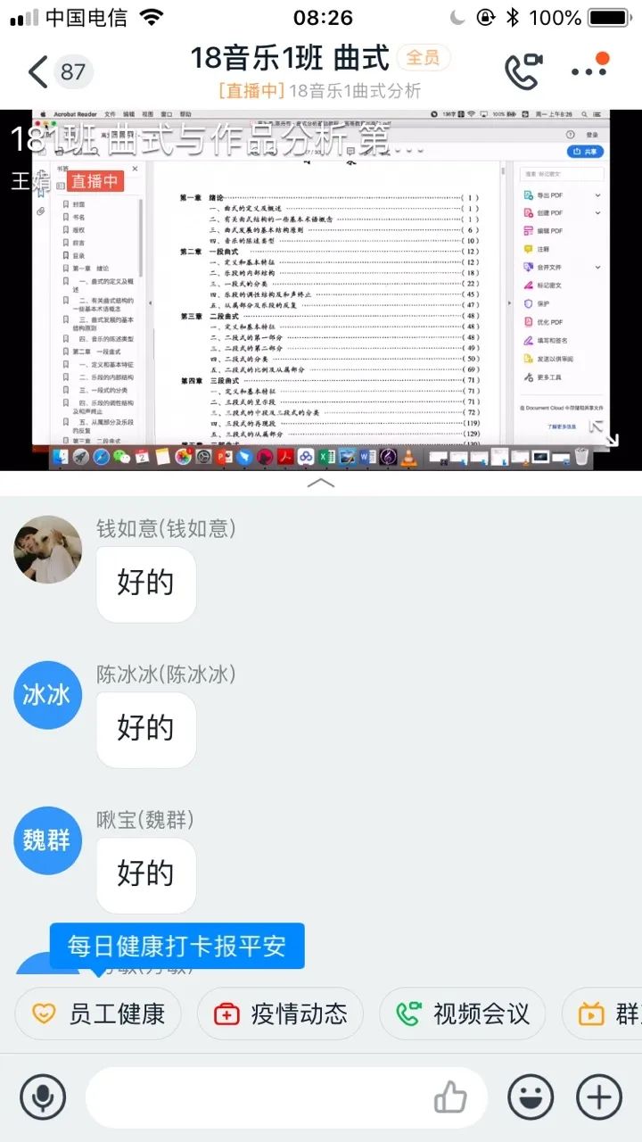 同学们积极参与线上互动,学习状态良好,学习热情高涨。线上学习中课前由班长提前发起“视频会议”进行截屏签到打卡;其次,播放学院杨书记送给学生的《书记第一课》音频,测试线上网速、连麦与互动情况。