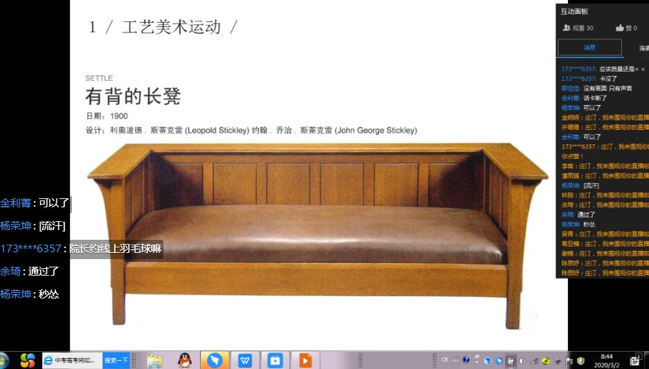 3月2日,学院正式开启线上教学,当天共有15位教师,开出15门本科课程,19个线上教学班共512名学生如期线上“开学”。从当天情况来看,线上“开学"首日的教学秩序平稳,教学效果良好。集体课堂教学和专业课“一对一”课程中老师们主要采用超星学习通、钉钉群、微信群、腾讯QQ群等工具,如音乐系王娟老师在钉钉群讲授《曲式分析》课程,采用教师讲述与PPT动画、音响等教学工具的同步授课方式。设计系项玮老师、美术系钱海琴老师也在钉钉群通过示范+案例讲解的授课方式进行。