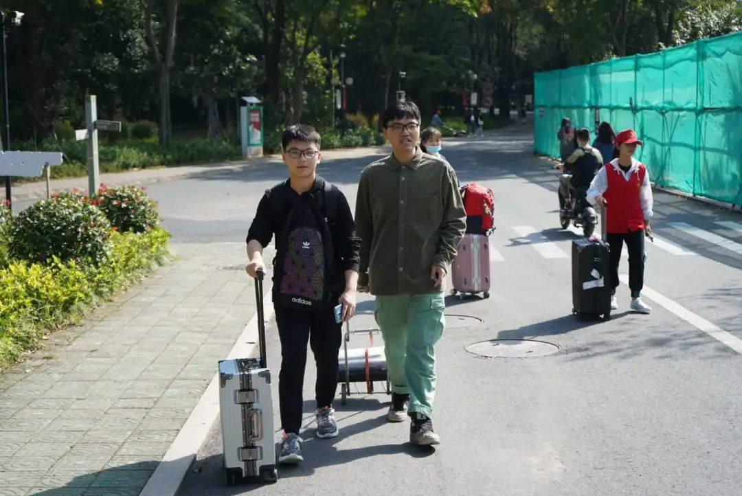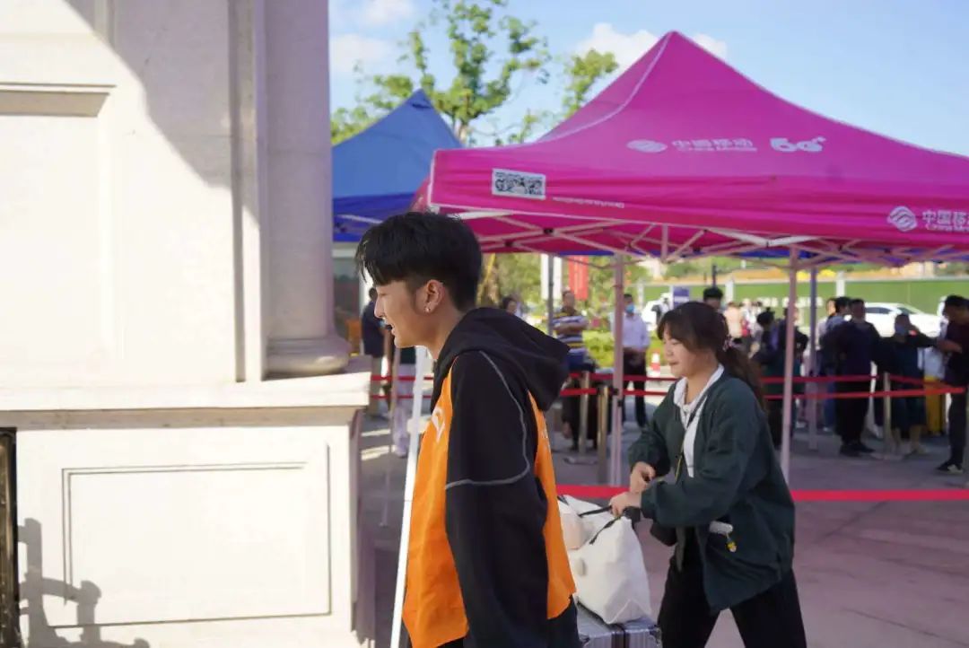 志愿者穿梭于迎新现场,时刻等待着为新同学伸出援手,帮他们提行李,给他们带路。