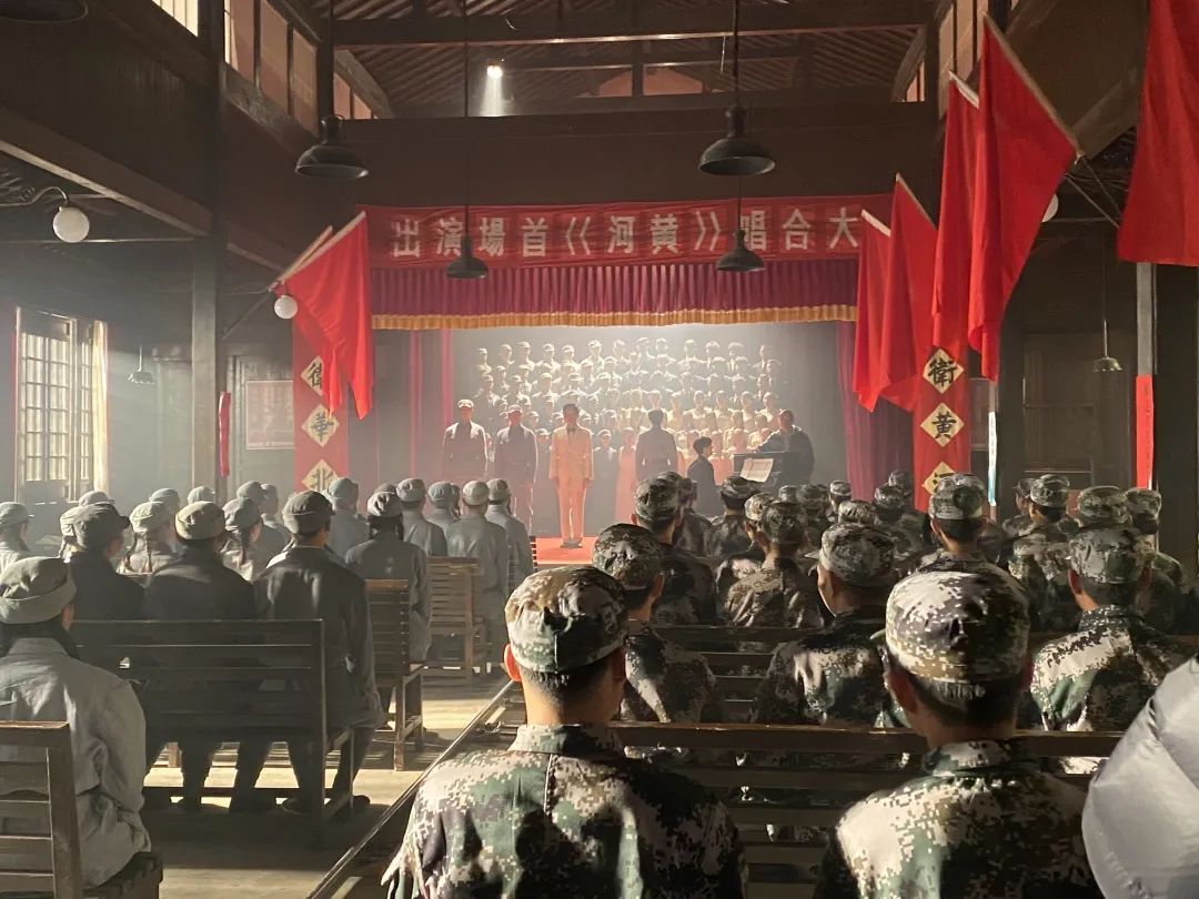 其中我校学生参与拍摄的《黄河在咆哮》板块是以冼星海创作《黄河大合唱》为线串起中华民族艰苦卓绝的抗战史。以奔腾壮阔的黄河为意象,充分表现我党在抗日战争期间“中流砥柱”使命担当和“一往无前”的革命气概,同时通过文艺知识分子对延安的向往,抒写红色延安精神。