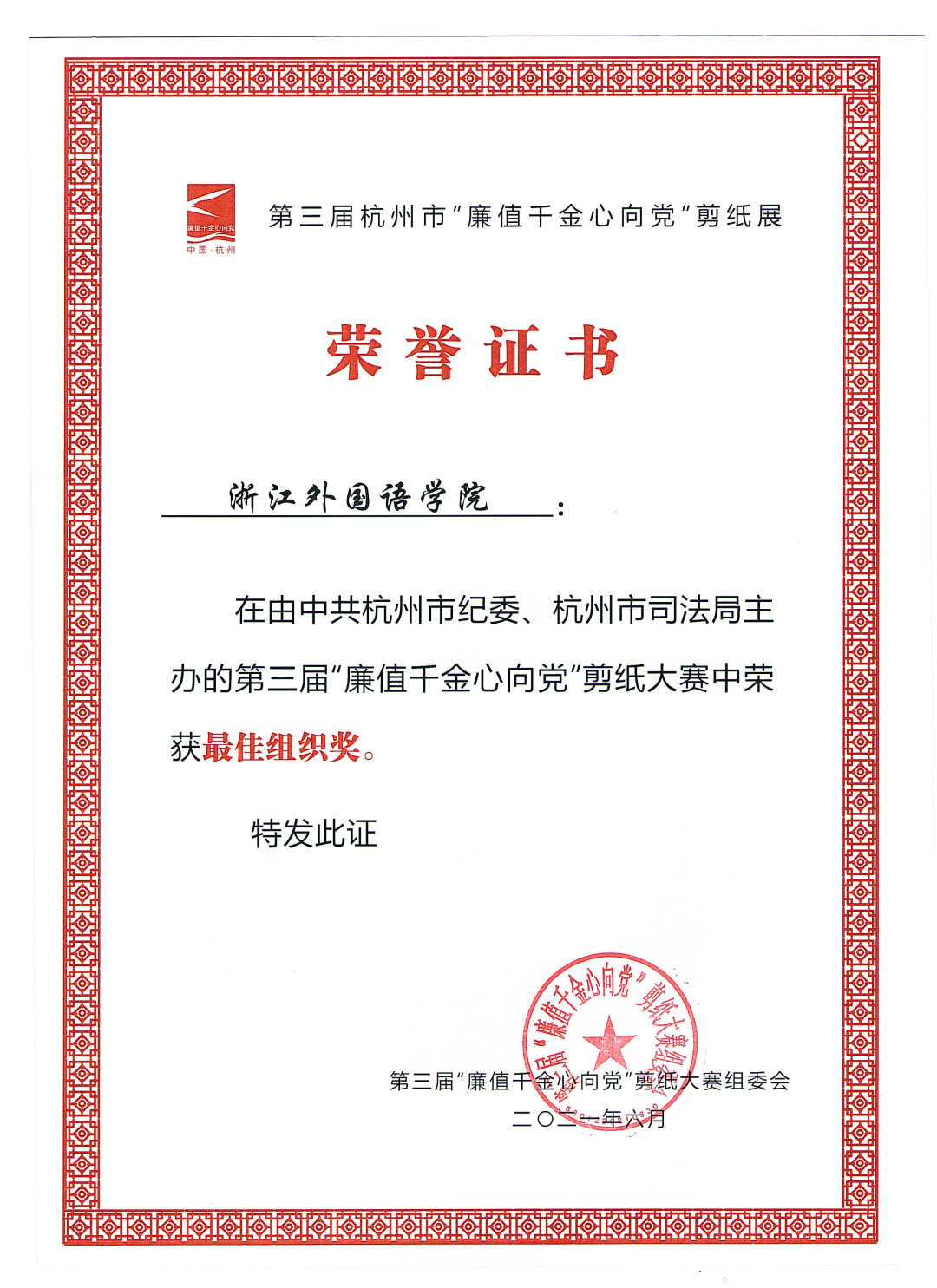 6月29日,杭州市第三届“廉值千金心向党”剪纸艺术大赛落下帷幕,获奖作品在市民中心展出。我校17美师1班李烨琳作品《时代的足迹》、17美师2班苏嘉莹作品《清正廉明》荣获精雕细刻奖,我校获第三届“廉值千金心向党”剪纸大赛最佳组织奖。
