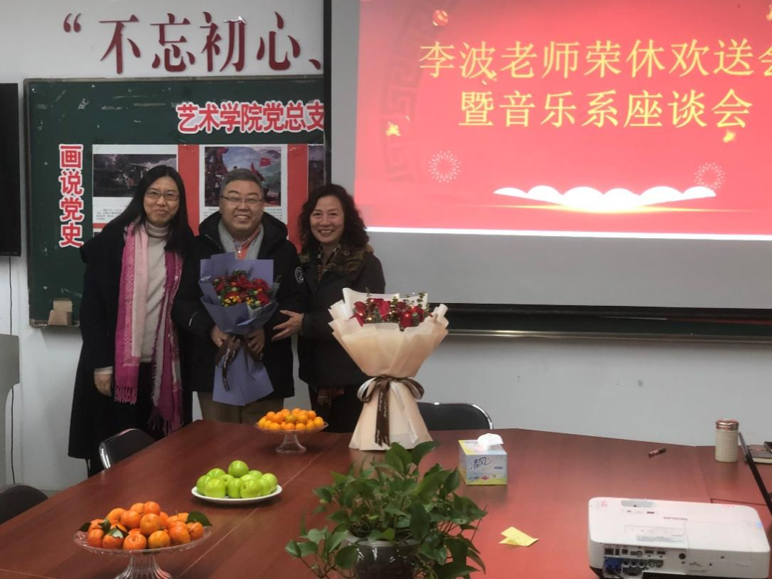 举行李波老师荣休欢送会暨音乐系座谈会。院长李敏、党总支书记胡晓红、退休教师代表龚钢教授参加欢送会。欢送会由音乐系主任周炜娟主持。