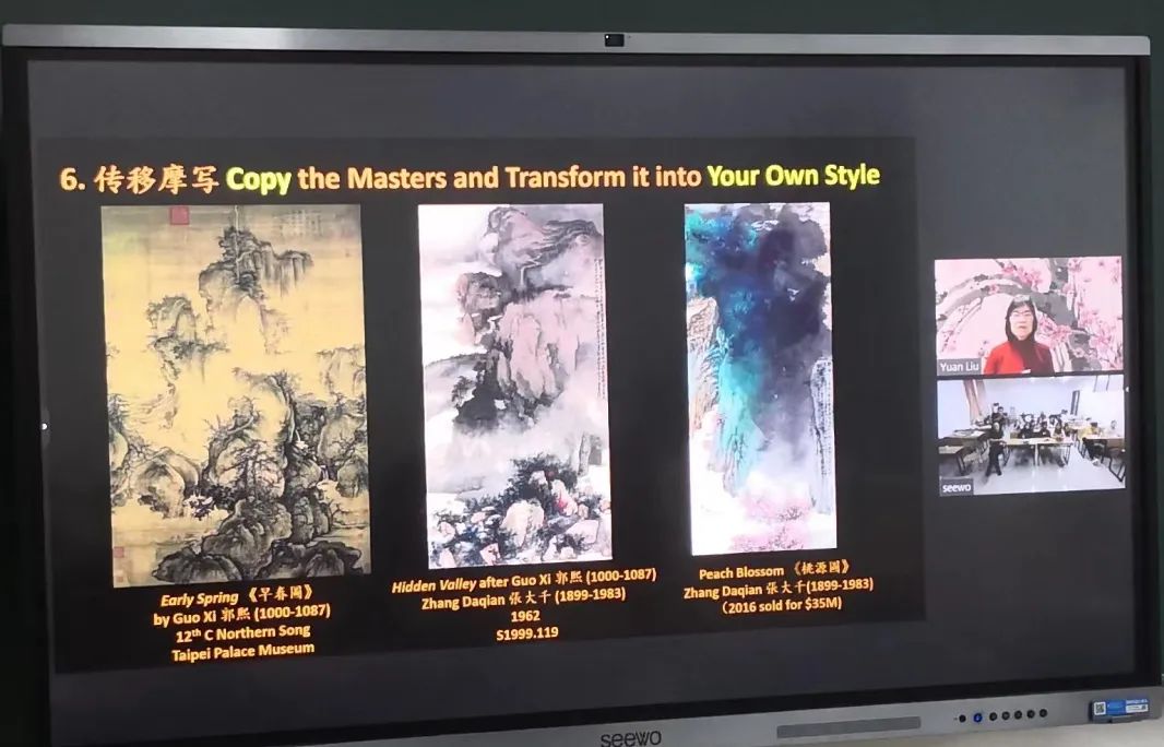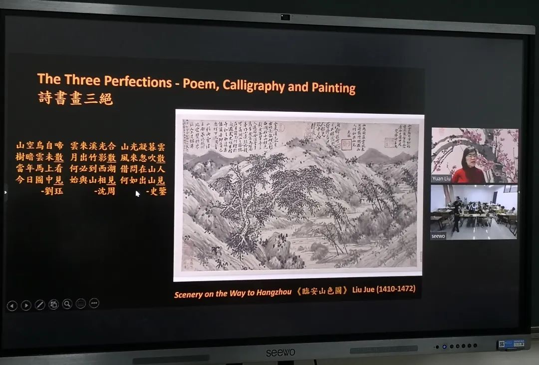 主讲专家刘嫄博士,采取中英文结合的方式,向师生们详细地介绍了该博物馆多幅古代中国画珍藏。同时通过讲解南北朝艺术理论家谢赫的“六法”,深入浅出地分享了中国画技法知识。让听众感到收获满满!本次讲座在现场师生积极地参与与主讲专家提问交流环节后圆满结束。
