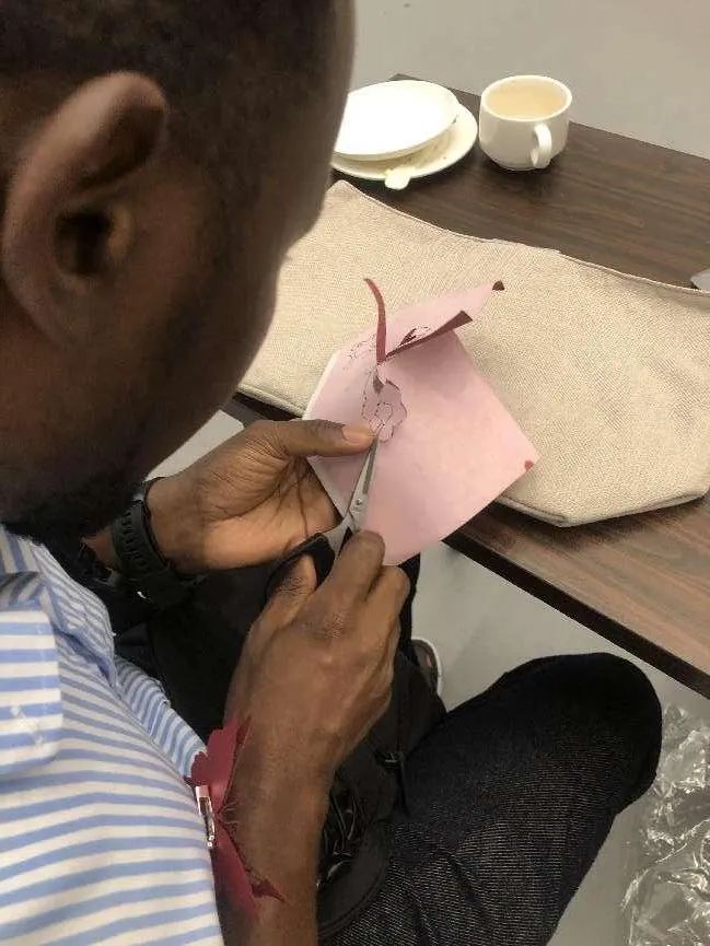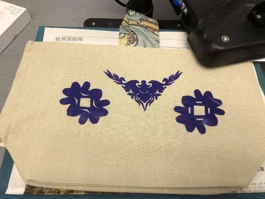 钱海琴老师向国际友人讲授剪纸相关知识并分享展示剪纸作品,嘉宾们对此也表示出极大的兴趣,在师生的共同协助指导下,国际友人也开始动手在热转印纸上绘、剪出自己喜欢的纹样,并在包袋上进行转印,收获了属于自己的DIY独特风格的包包。