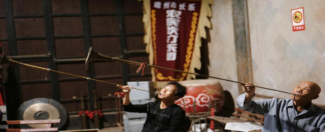 10月5日晚上至6日下午,调研组一行七人随即来到嵊州市长乐镇文化宫、黄泽镇白泥坎村,观看了嵊州西长乐农民吹打乐团的精彩演出,采访了传承人魏喜明、吴先华并走访看望了老一辈传承人郭金木。其中艺人们表演的《欢乐农家》、《九州方圆》等多首吹打乐作品,给我们留下了深刻的印象。这些作品的创作多以农村生活为题材,真实的表达了乡民的生活日常和思想情感,散发着质朴而沁人心脾的泥土芬香。直面这支长期活跃在嵊州山乡的农民乐班,无不为之精湛的技艺及娴熟的演奏而震撼。