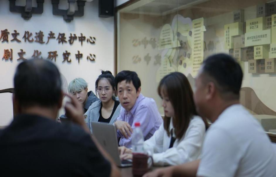 10月5日下午的座谈及研讨活动,安排在嵊州市非遗中心会议厅,参会人员有非遗中心主任娄少峰、非遗中心副主任丁赛贝尔、国家级非遗项目《嵊州吹打》省级传承人魏喜明、绍兴市级传承人吴先华以及麦田影院