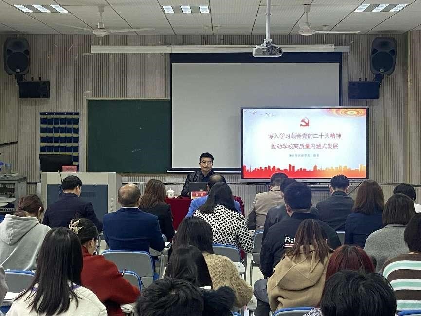宣讲党的二十大精神。学院领导班子、师生代表,与来自中文学院学生党支部、组织部党支部等师生党员共50余人参加了聆听。