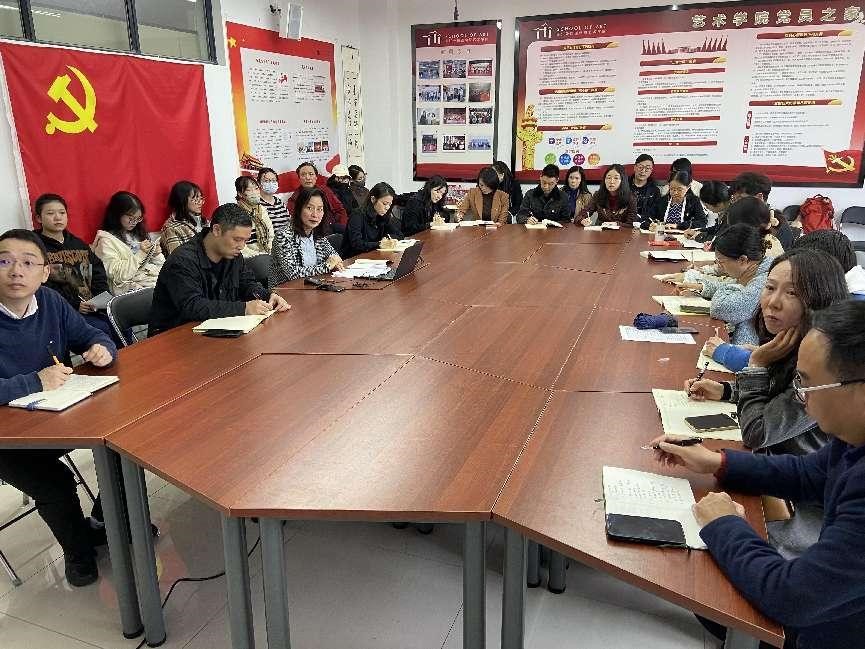 11月25日,党总支书记胡晓红宣讲党的二十大精神,音乐系教工党支部、美术系设计系教工党支部全体党员,学生党员代表等30余人参加了聆听。