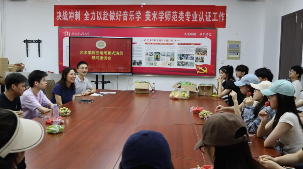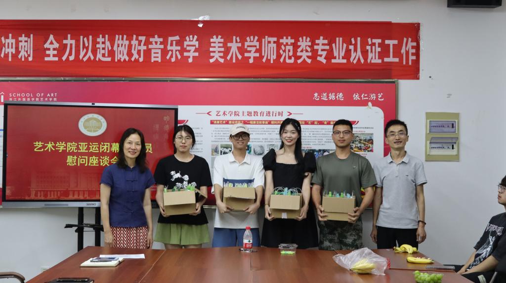 参加亚运会闭幕式的46名同学进行慰问和座谈。