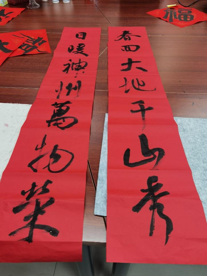 美术系吴大红、颜子茗、林晋生几位老师用春联和福为学院祈福。他们用行书、隶书、草书等各种字体在红纸上表达对新年的美好祝愿,书写行云流水,字迹刚劲雄健,一个个吉祥美好寓意的福字跃然纸上,一股股沁人心脾的墨香飘荡空中。几位老师的“墨宝”备受追捧,获得了围观群众的阵阵喝彩。“新鲜出炉”的春联获得了大家的争相领取,现场气氛十分火爆。大家在领取春联的同时,享受到了一场“书法盛宴”,领略到了书法的无穷魅力。
