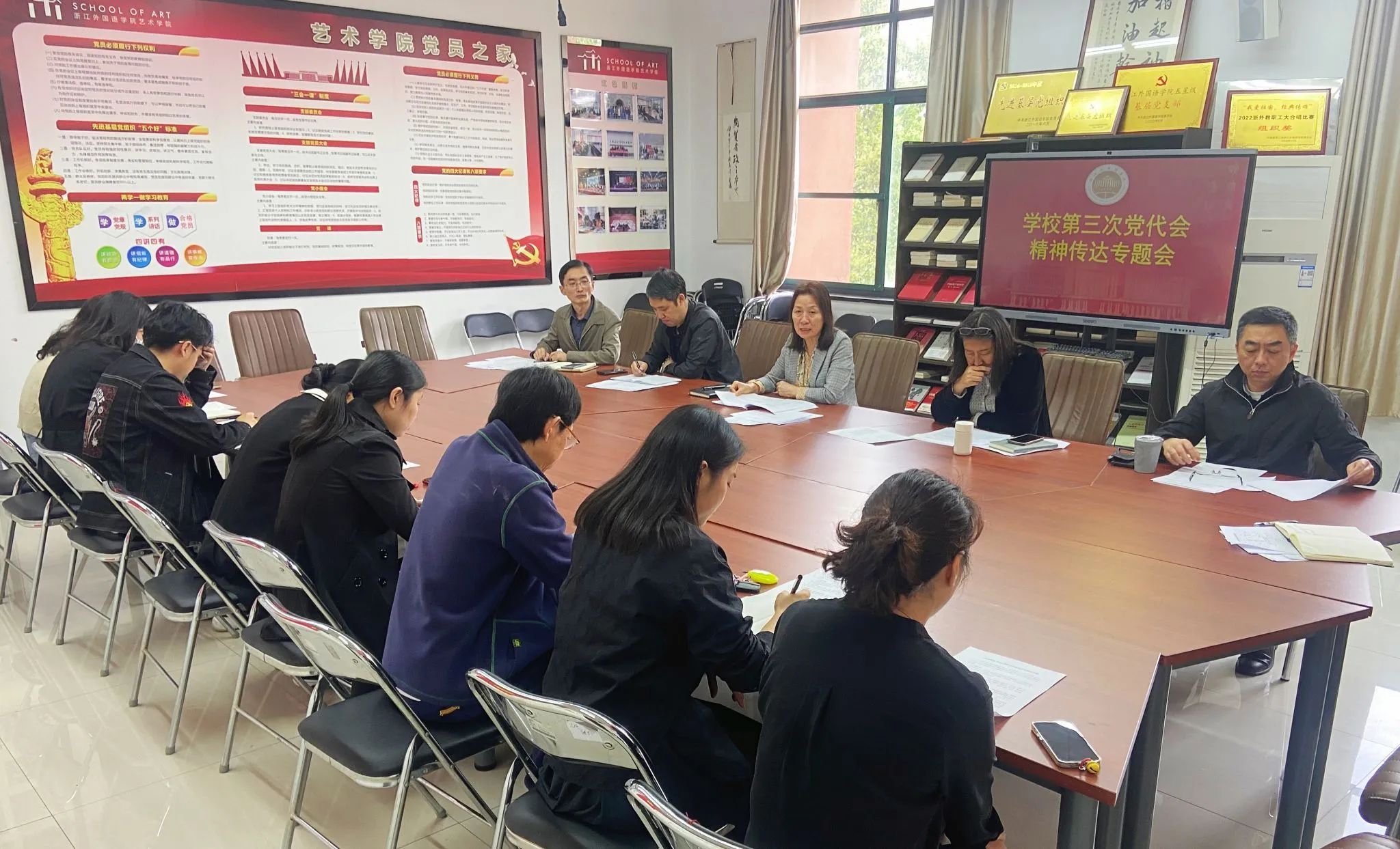 学院党总支书记胡晓红传达了学校第三次党代会精神,深入解读了党代会工作报告。她指出,本次党代会发展蓝图已绘就,目标任务明确,学院班子和党员同志要充分学习贯彻党代会精神,用好有利时机,借助北大合作的平台和资源,主动融入区域国别研究,增强艺术学科特色,提升美育品牌。全院教师要把深入学习贯彻落实学校第三次党代会精神作为当前的一项重要政治任务,把党代会精神贯穿到自身工作中的各个环节,凝聚全院力量,共同打造浙外艺术特色,推动学院事业高质量发展。