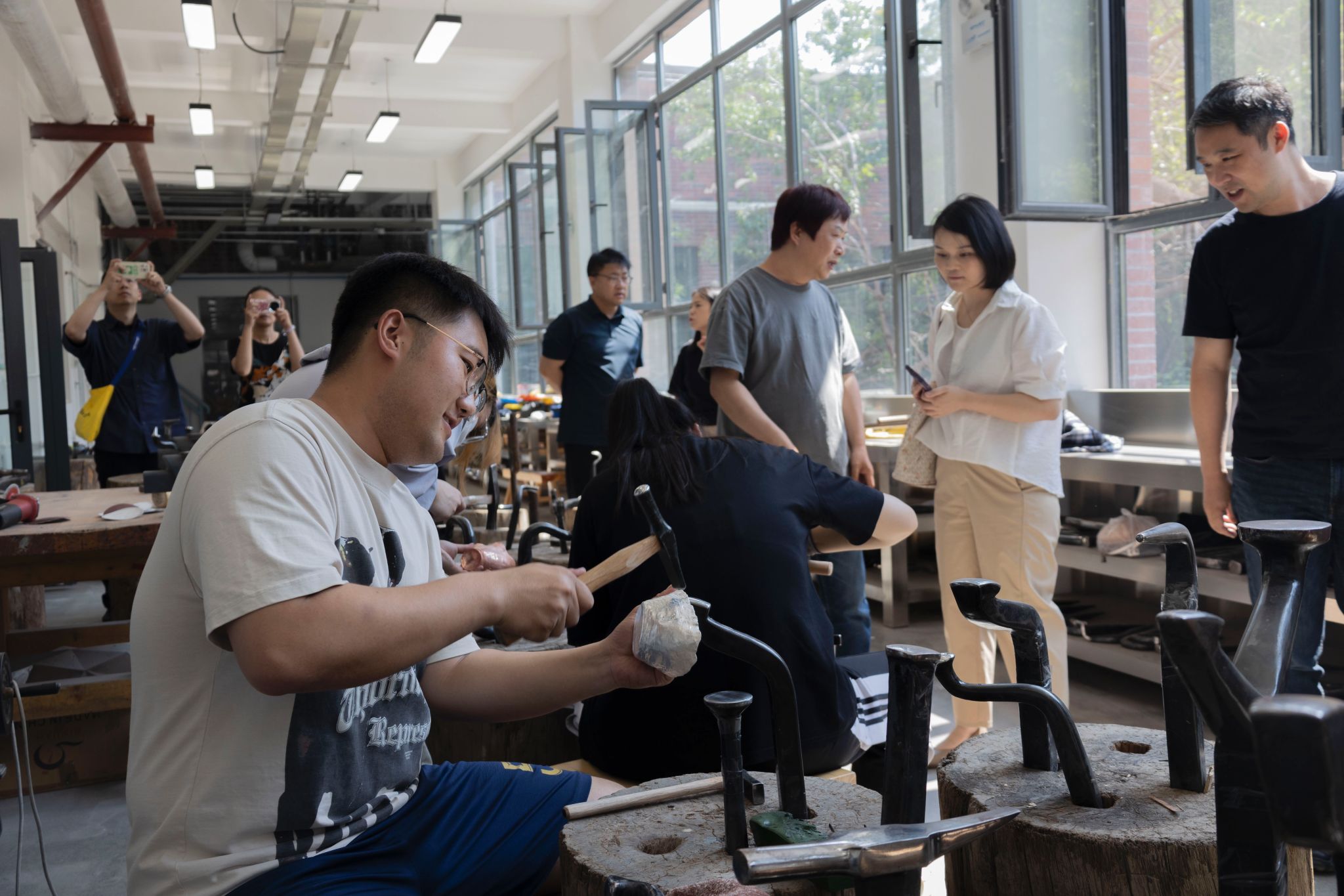 6月5日上午,调研团队前往中央美术学院。调研团队一行首先参观了央美学生的课外实践、采风考察等相关课程的优秀作品展览。在设计学院,设计学院院长、教务处处长郝凝辉详细介绍了中央美术学院设计学院以学生为中心,跨越学科、打破设计专业壁垒的新型设计教育模式。随后,调研团队在相关负责人陪同下,参观了首饰、木艺、印刷、影像等实验室,深入了解了中央美术学院设计学院的实践教学情况。