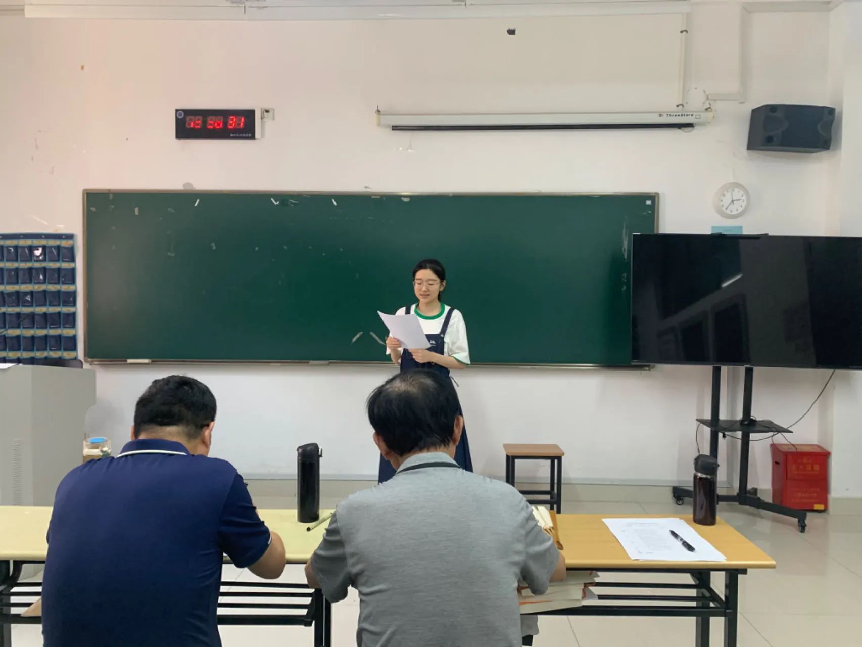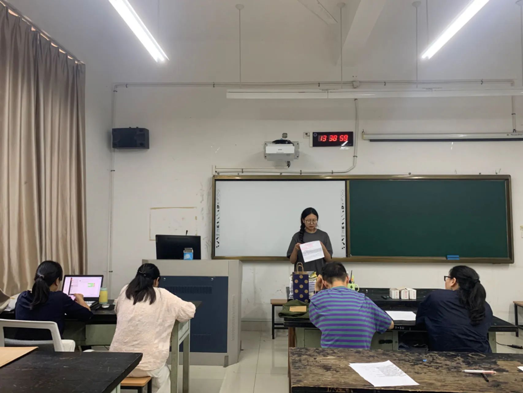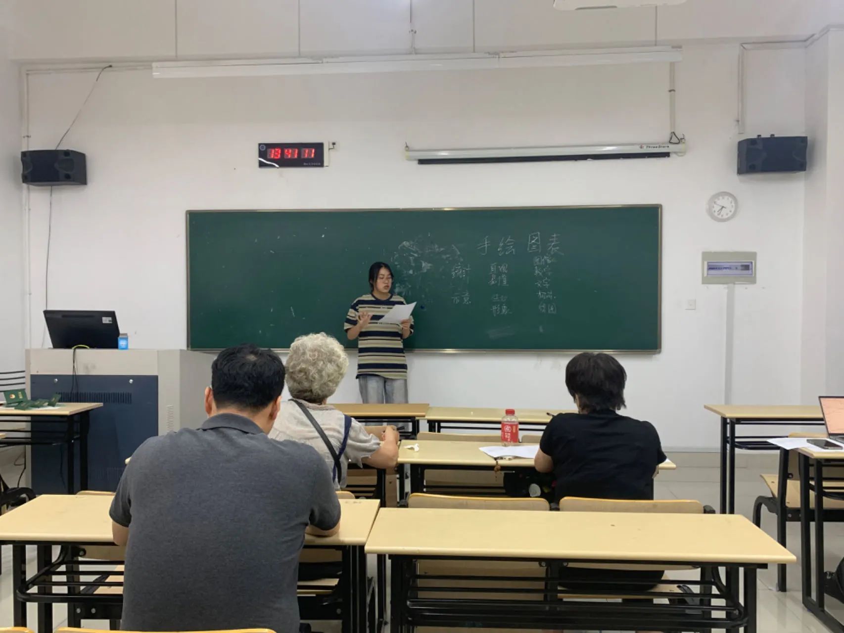 本次师范技能考核根据国家教师资格证考试的内容和流程进行,在3个不同的考场中,师范生们通过结构化答题、模拟上课、板书设计与书写、说课等考核环节展示美术专业师范技能。
