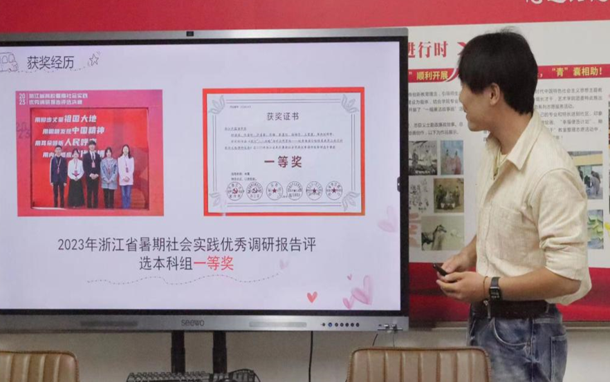 赴浙江桐乡、青海德令哈影像创作实践小分队的调研报告《践行“八八战略”推动共同富裕——赴青海德令哈探索高原江南花的绽放之路调研报告》获浙江省暑期社会实践优秀调研报告评选本科组一等奖。该队伍成员代表苏凌豪分享了他的实践经历,围绕如何撰写高质量的社会实践报告以及如何提升实践活动的社会影响力,为在场的同学们提供了宝贵的建议,为即将开始的社会实践奠定了坚实的基础。