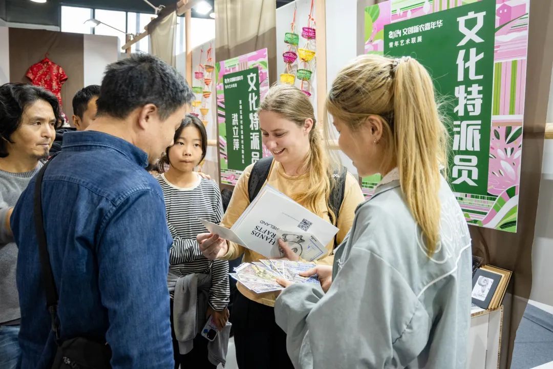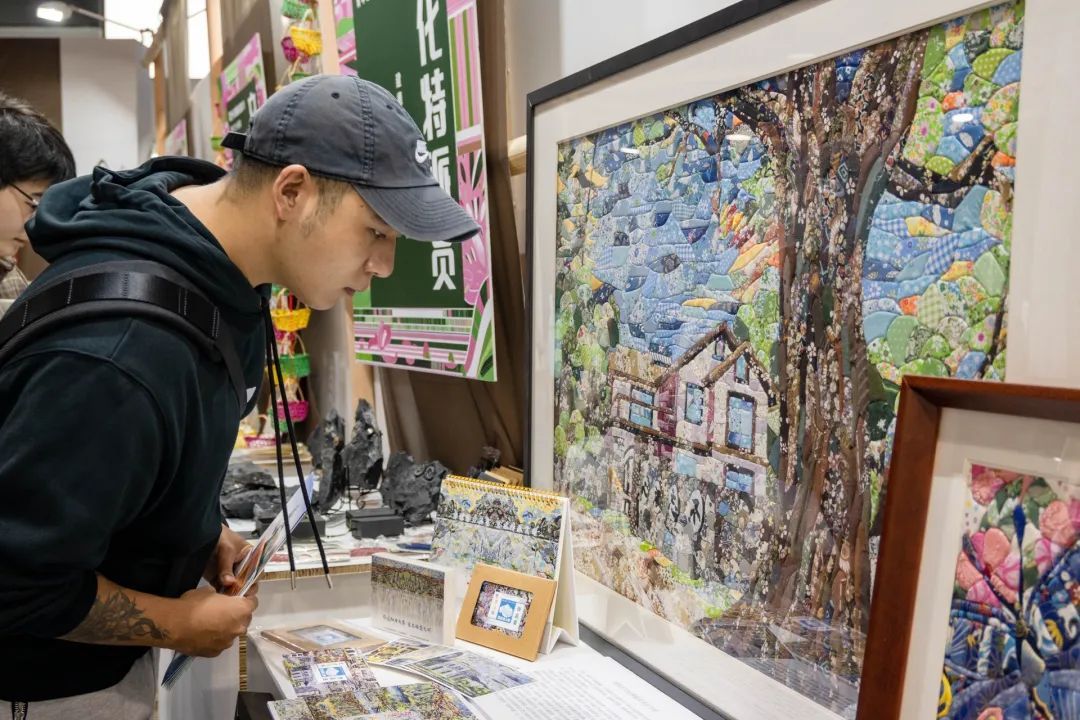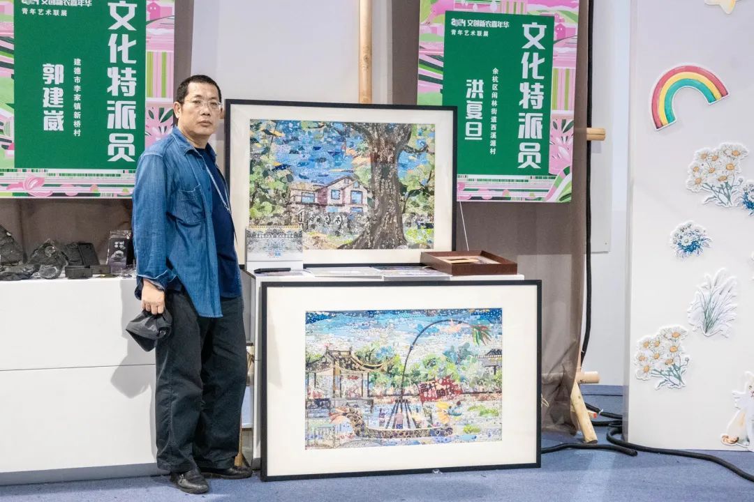 洪复旦老师作为余杭区闲林街道文化特派员工作成果——“智慧堆绣”艺术作品亮相展览,吸引大量参会者与游客,在互动环节分发“智慧堆绣”艺术作品明信片反响热烈。