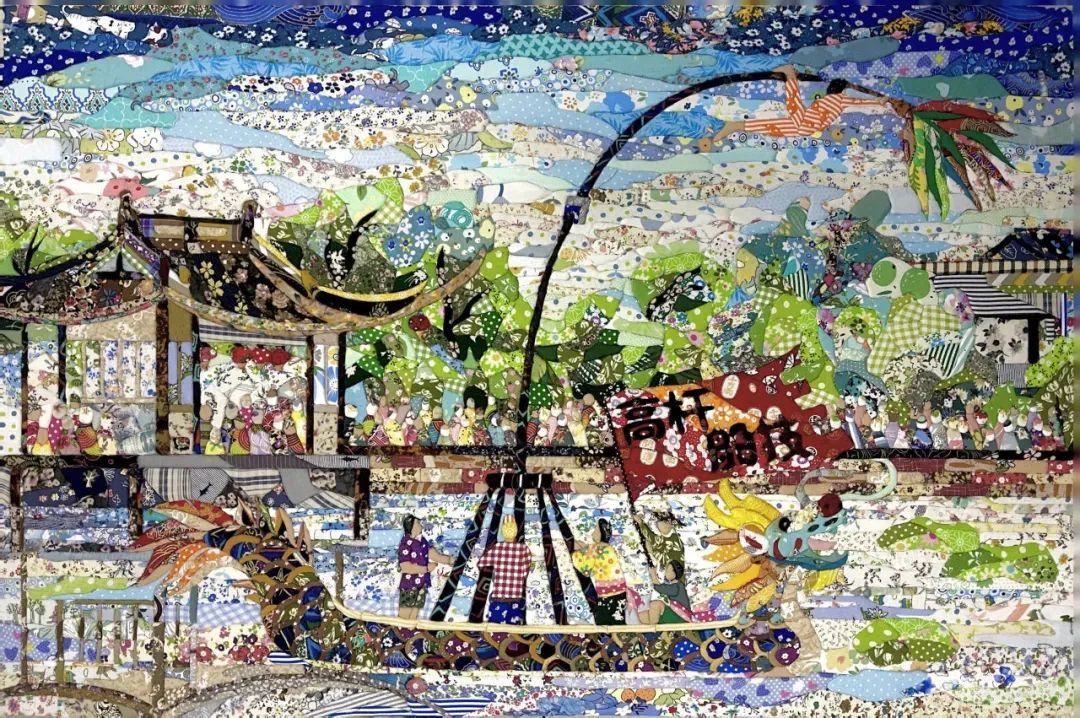 一幅“智慧堆绣”艺术作品为“不忘初心”,展现了“人间四月天,西溪源上春”的现代乡村风貌。在杭州城“三区”交界处、午潮山下的余杭区闲林,藏着一座美丽的西溪源村,作为当下走出“四源”治理现代化的新路子的模范村,正在打造宜居宜业的和美西溪源;同时作为杭州西溪的源头,在乡村振兴的发展中正努力从“非遗助力共富、艺术传承文明”的视角保护好这一江东流春水,谋划建设西溪源文化大景区,与西溪湿地相映生辉,时时保持春天的美好和希望,营造环境幽静、生活安逸的理想乡村境界。另一幅作品展现的是桐乡洲泉马鸣驿“高杆船技”的盛景。文化名镇洲泉孕育了高杆船技等国家级非物质文化遗产,马鸣驿清明蚕花水会中的表演誉满江南,作品以此为题参加多次展出并获奖。