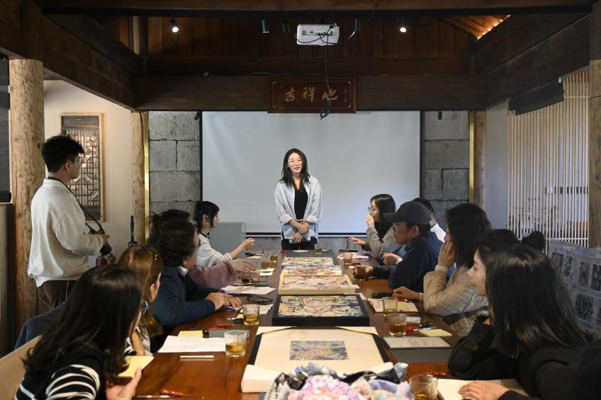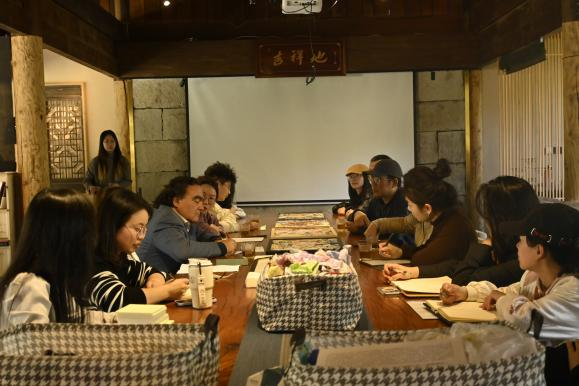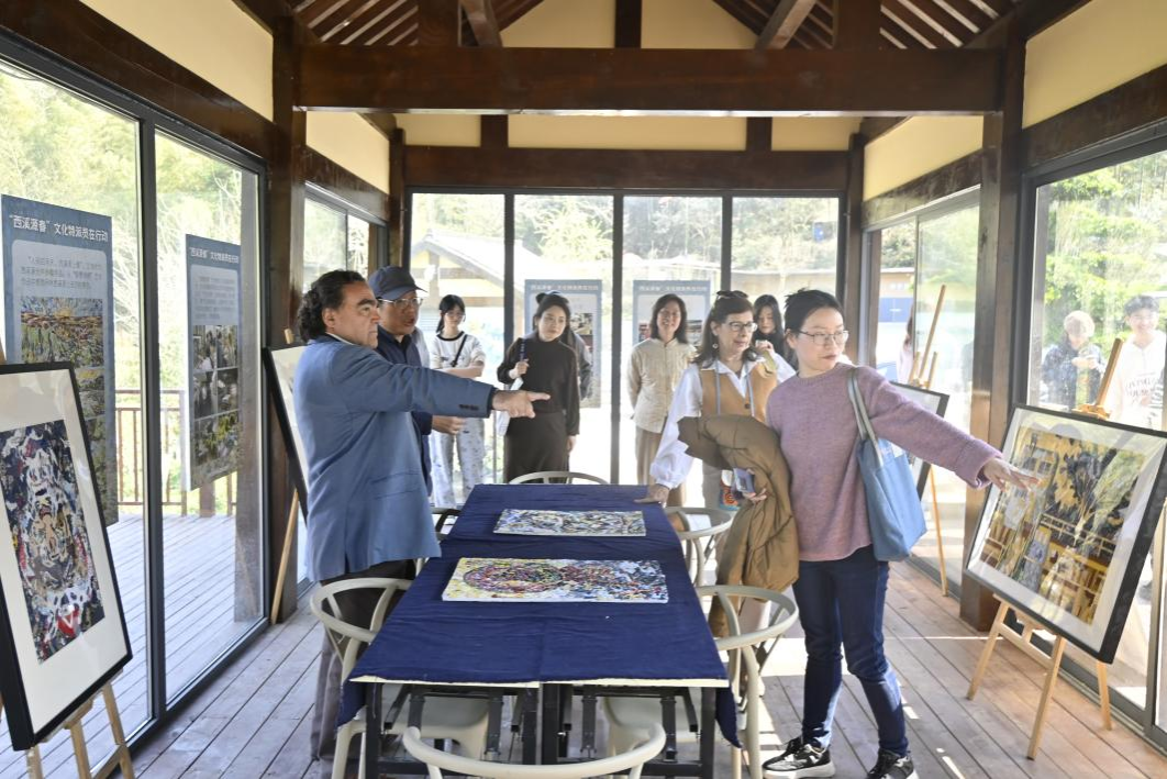 活动伊始,全体人员参观了洞山“乡村无界美术馆”山丘议事厅的智慧堆绣展。一幅幅精美的堆绣作品,以其独特的艺术魅力吸引着众人的目光。细腻的拼接、丰富的色彩,展现出传统堆绣艺术的深厚底蕴,让现场的外籍专家、师生们赞叹不已,对中国民间艺术有了更直观的感受。