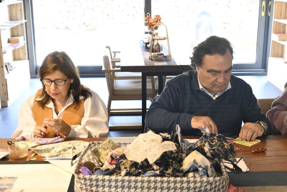 党委书记胡晓红等院领导与外聘教授克劳迪奥·罗哈斯·拉奎尔夫妇共同参与创作,现场呈现中外文化交融的生动图景。参与者通过针线布料的语言展开跨文明对话,创作一件件饱含着创意与心意的作品。