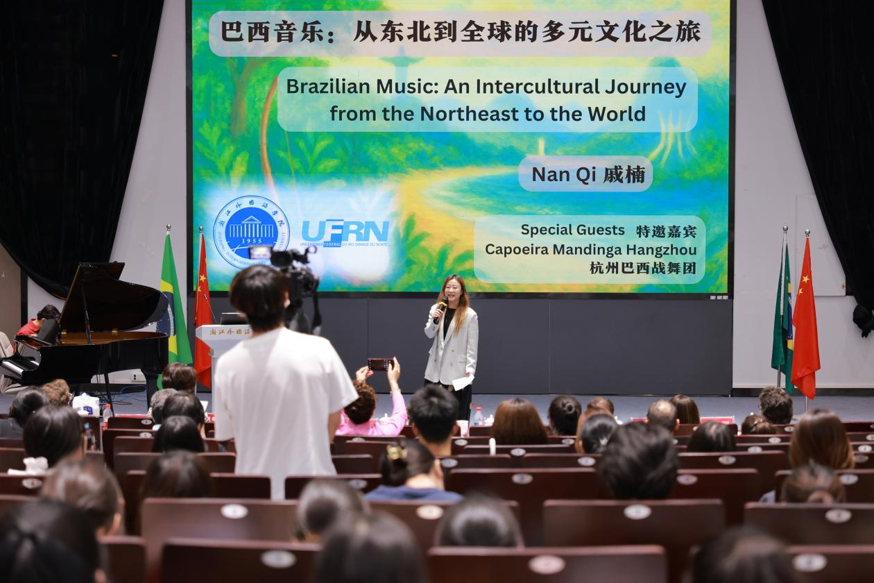 之后,戚楠为大家带来了名为“巴西音乐:从东北到全球的多元文化之旅”的讲座音乐会,通过互动、钢琴演奏,与杭州巴西战舞团合作等多元展示形式,让大家系统性感受到了巴西音乐、巴西文化的热情洋溢。Durval与Alexandre为大家带来了“Histos”系列五部作品的全球首演,为广大浙外师生带来了一场视听盛宴。本次活动吸引了全校200余名师生参加,为广大浙外学子搭建了一个中巴音乐文化交流、增进中巴友谊的新平台。