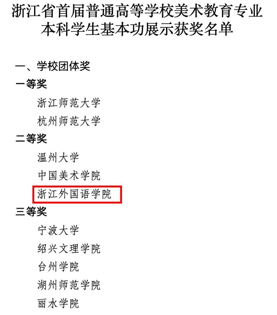 师生与省内兄弟院校深化了互学互鉴。这份佳绩将激励全院师生继续秉承教育初心,精进专业本领,不断提升综合素养,为赋能新时代美育高质量发展、提升全民审美素养、建设文化浙江贡献浙外艺术人的智慧与力量!