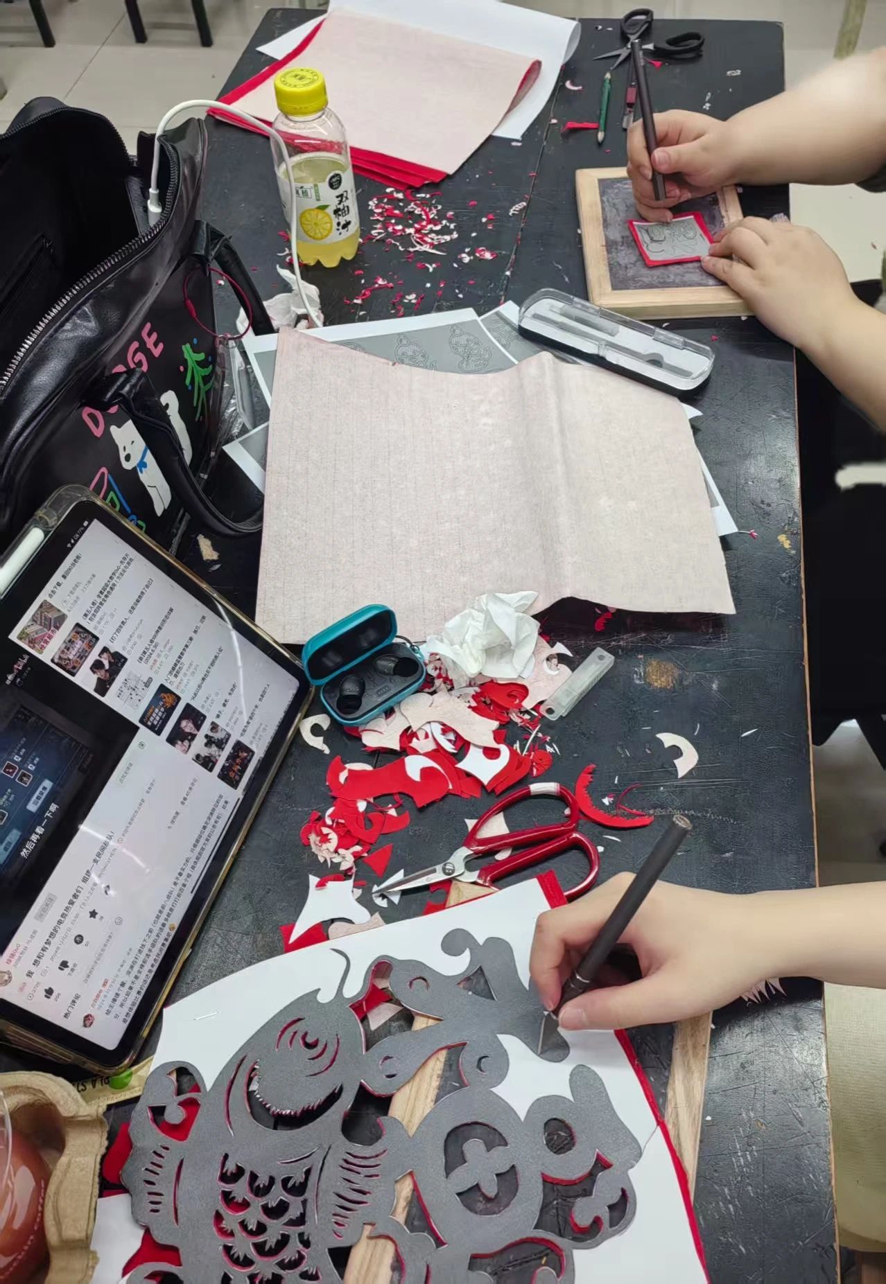 指尖的传承:在教室创作环节,成员们凝神静气,指尖翻飞,刻刀与红纸共舞。每一次精准的下刀,每一次碎纸的剥离,不仅是对技艺的磨练,更是与古老匠心的无声对话。成员潘佳琳形容此过程“指尖翻飞间慢慢回忆起课上讲的技巧”,传统在手中悄然复苏。