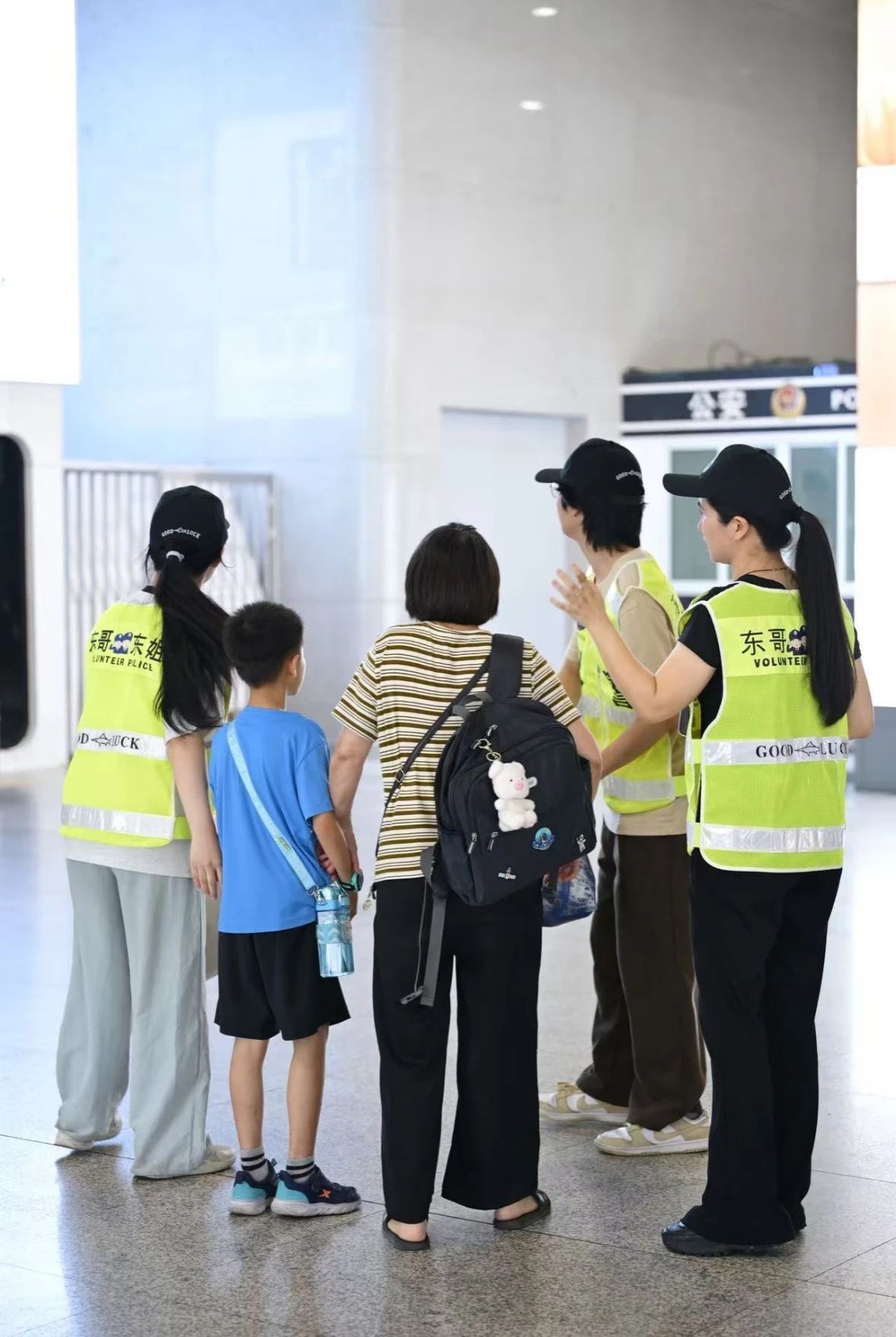 与东方语言文化学院的7名学子,分别是队长22音乐1班樊鸿瑜、队员22音乐1班罗逸宁、24韩语1班吕姿乐、22音乐1班杨喻、22音乐1班唐啸、22音乐2班黄林轩、22音乐2班钟靖宇,在指导老师孔俏俏老师的带领下,深入繁忙的交通枢纽,以悠扬乐音传递城市温情。他们不仅穿梭于旅客之间提供暖心服务,更与坚守岗位的东站志愿者队伍、执勤民警深入交流。