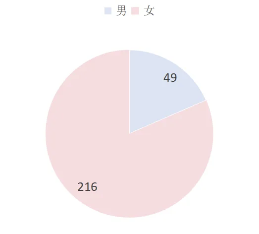 这个大家庭,男生有 49 人,女生有 216 人,男女比例约为 1:4。其中艺术与科技(传统手工艺方向)专业男生最少,只有 7 人。