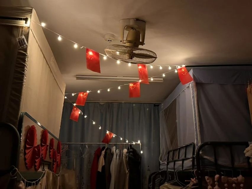 我们的寝室以深蓝窗帘打底,用暖色灯带和星星灯串营造温馨氛围。天花板悬挂着五星红旗,墙面点缀了日历挂件和照片装饰。整体布置整洁有序,既体现了青春活力,又融入了家国情怀,让这里成为充满温度与归属感的小天地。
