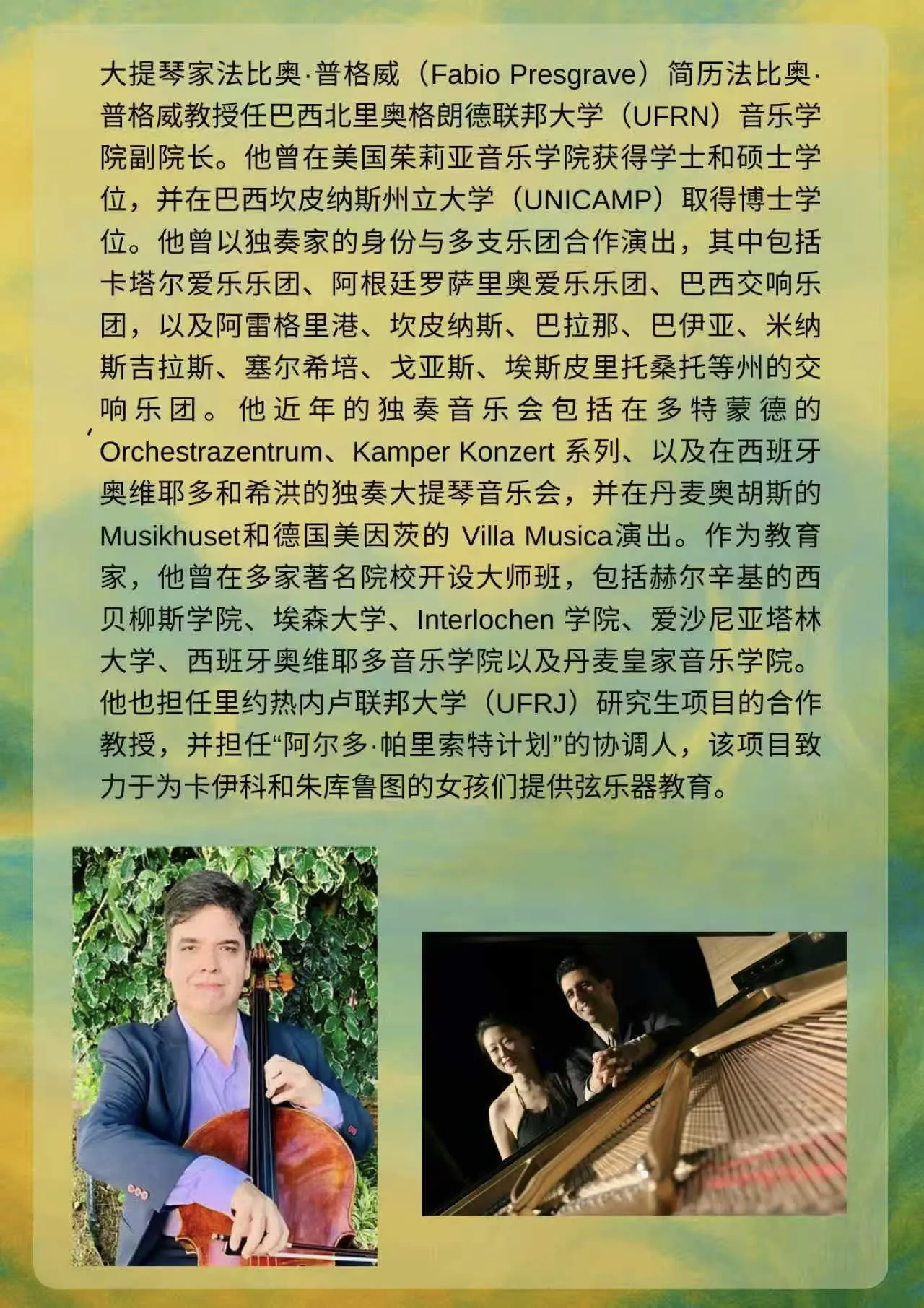 大提琴家法比奥·普格威(Fabio Presgrave)简历法比奥·普格威教授任巴西北里奥格朗德联邦大学(UFRN)音乐学院副院长。他曾在美国茱莉亚音乐学院获得学士和硕士学位,并在巴西坎皮纳斯州立大学(UNICAMP)取得博士学位。他曾以独奏家的身份与多支乐团合作演出,其中包括卡塔尔爱乐乐团、阿根廷罗萨里奥爱乐乐团、巴西交响乐团,以及阿雷格里港、坎皮纳斯、巴拉那、巴伊亚、米纳斯吉拉斯、塞尔希培、戈亚斯、埃斯皮里托桑托等州的交响乐团。他近年的独奏音乐会包括在多特蒙德的Orchestrazentrum、Kamper Konzert 系列、以及在西班牙奥维耶多和希洪的独奏大提琴音乐会,并在丹麦奥胡斯的Musikhuset和德国美因茨的 Villa Musica演出。作为教育家,他曾在多家著名院校开设大师班,包括赫尔辛基的西贝柳斯学院、埃森大学、Interlochen 学院、爱沙尼亚塔林大学、西班牙奥维耶多音乐学院以及丹麦皇家音乐学院。他也担任里约热内卢联邦大学(UFRJ)研究生项目的合作教授,并担任“阿尔多·帕里索特计划”的协调人,该项目致力于为卡伊科和朱库鲁图的女孩们提供弦乐器教育。