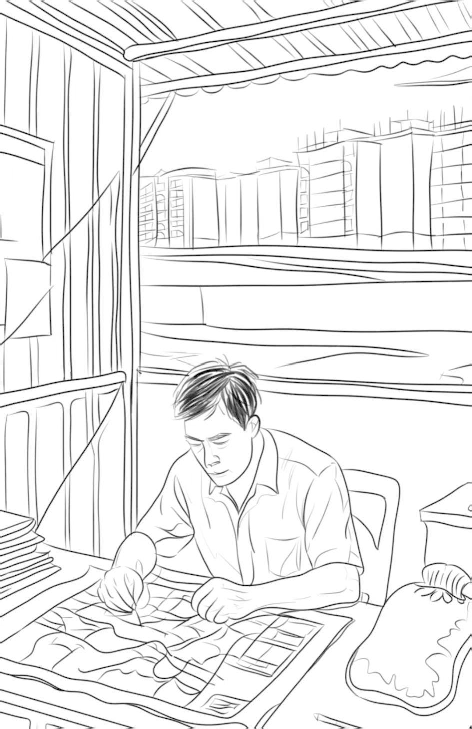 创作说明:画面的场景就是吴长青在拆迁板房中改安置方案的场景,突出他拒绝亲戚走后门、坚守承诺的画面,体现吴长青坚守廉政、一心为民的清廉作风。