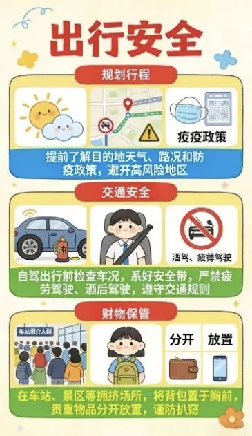 自驾出行的同学,遵守交通规则,不疲劳驾驶、不酒后驾车,提前检查车辆状况,避开出行与返程高峰,确保路途顺畅。