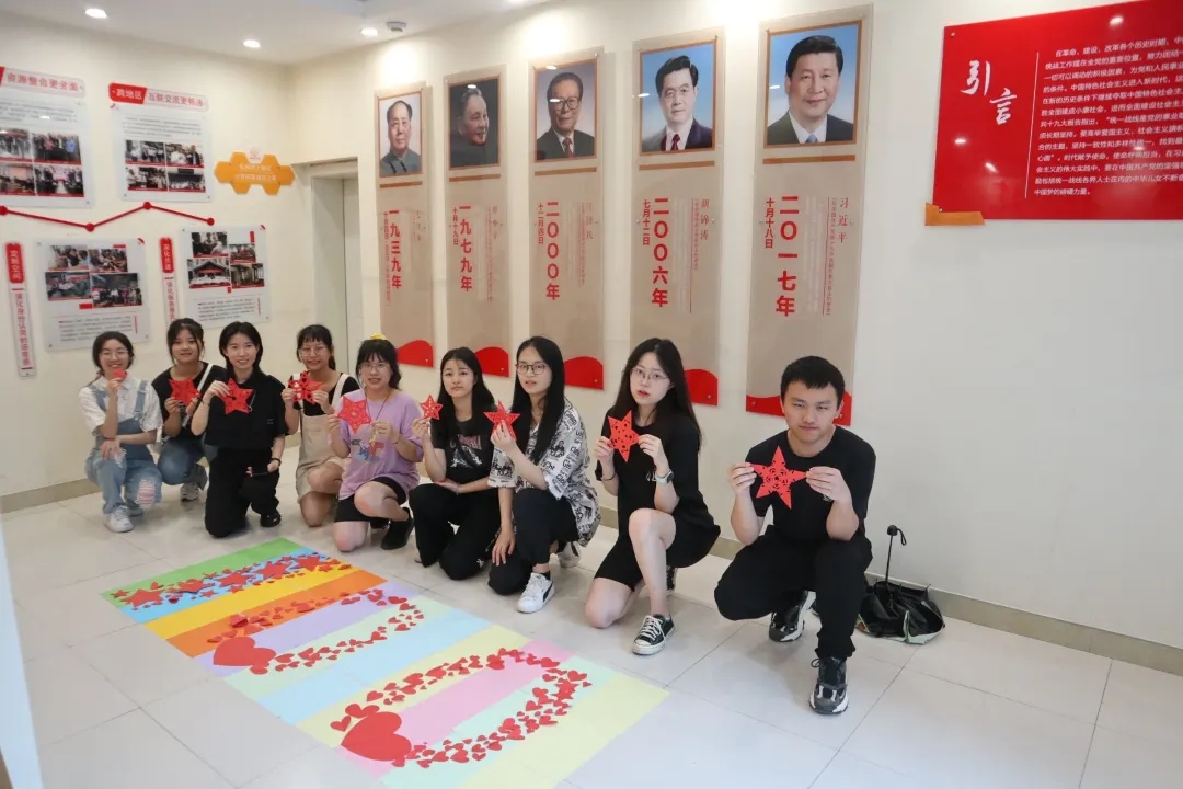 钱海琴老师指导,美术系学生屠斯语、李杭雨、朱夏珩、徐亿璞、王洁、张开渔、王馨、张潇、陈信邦作为志愿者参与作品的创作,共剪出了几百颗爱心和五角星作为给星星孩子们的礼物,在党的百岁生日之际,传递正能量。