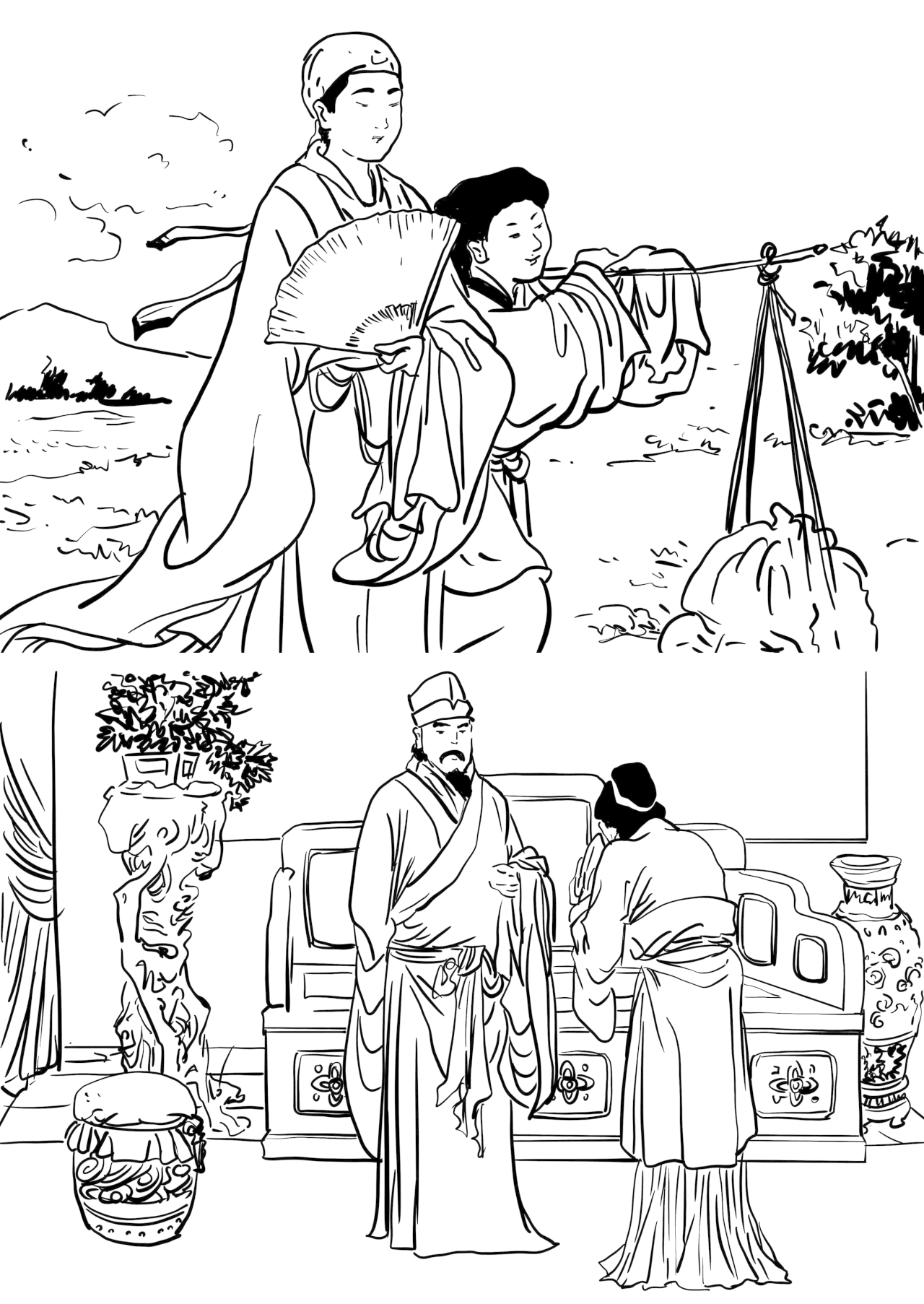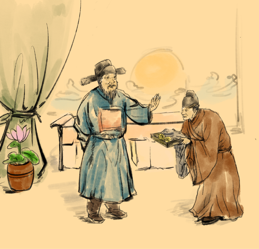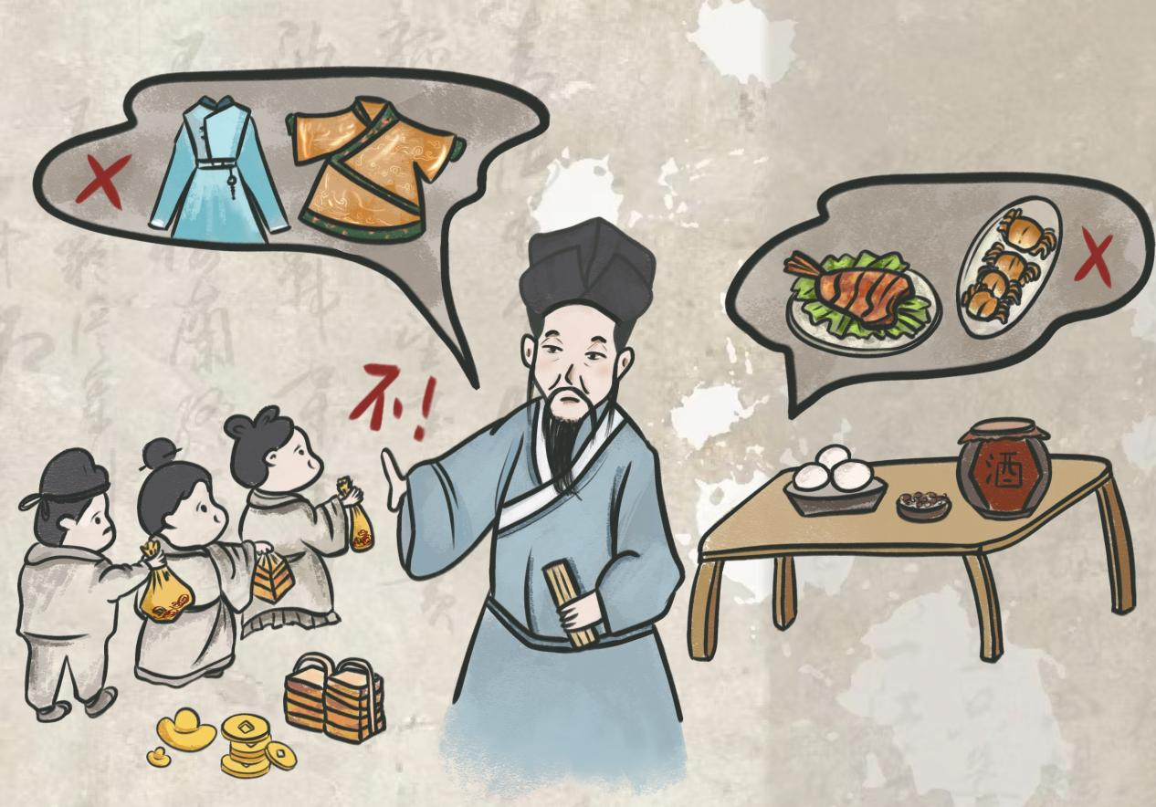 创作说明:画面的场景是王阳明生活俭朴,不穿丝绸,不食珍馐,拒绝贿赂的场景,用这个画面来告诉我们,无论身处何种环境,都要坚持对清廉、节俭、正直的不懈追求。