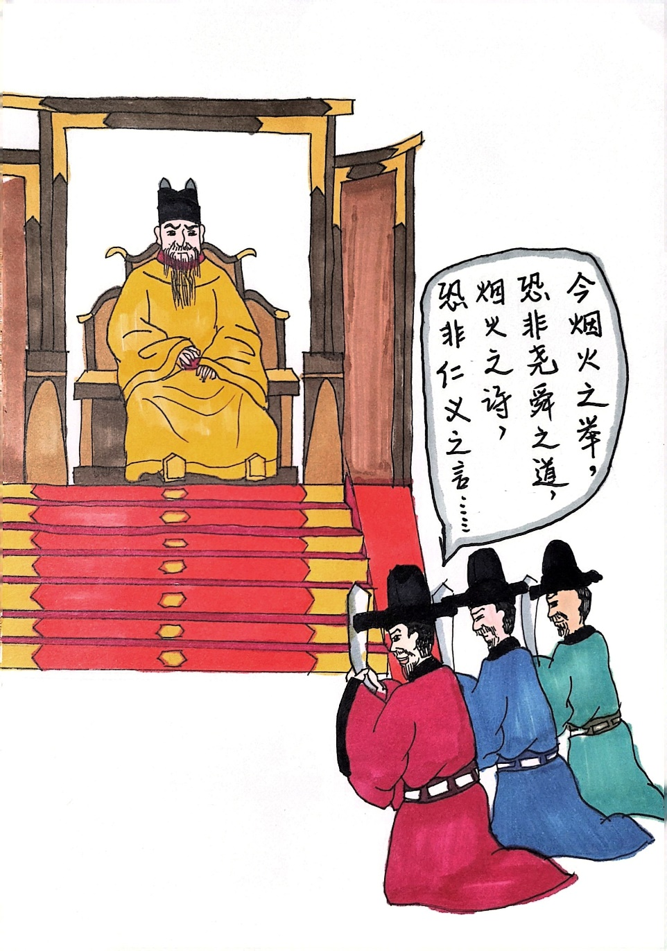 创作说明:画面的场景就是庄昶等人正直进谏,劝阻帝王奢侈行为的场景,用这个画面来创作,具有代表性,体现出他们坚守道义、不畏权贵的品质。