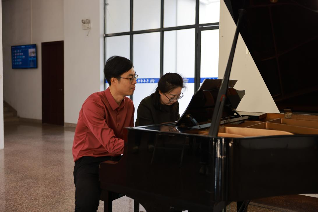 在启动仪式的第四个环节,吴岢霏老师与单良老师携手献上四手联弹《唱支山歌给党听》,他们的精湛技艺和饱满情感赢得了现场观众的热烈掌声。他们的表演也为“琴韵和山,共享乐章”音乐活动开了一个好头,为现场的同学们做出了示范和榜样。