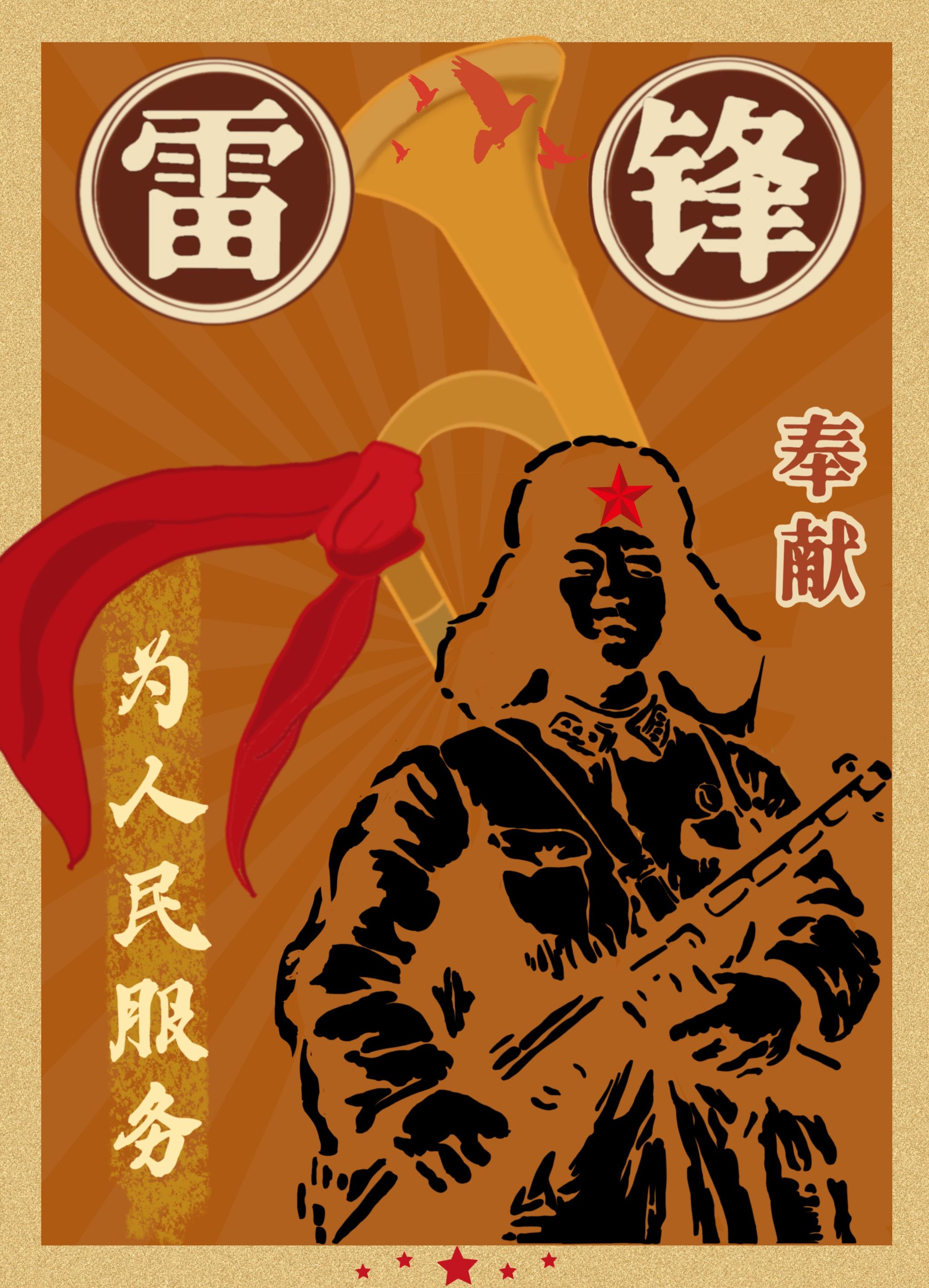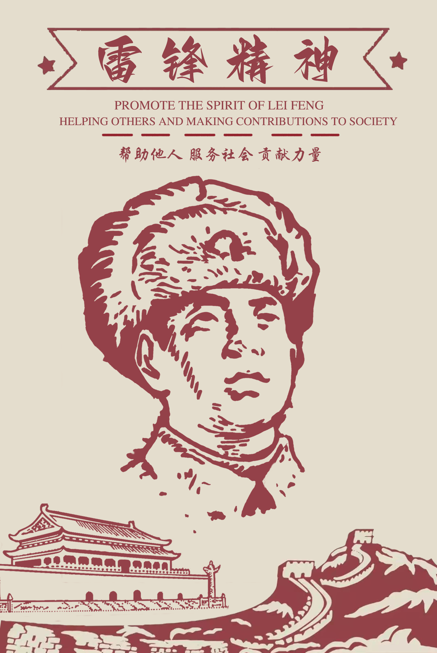 简介:雷锋的事迹深入人心,雷锋精神滋养着一代代青年。海报下方的天安门和长城,代表着我们的祖国和人民。在红色精神浸染下的我们将学习雷锋心中有爱、爱党、爱国、爱人民,全心全意无私奉献。