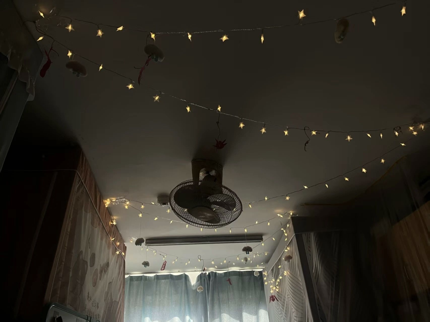 天花板上的星星灯,暖黄的串灯垂落下来,让我们寝室变得更加温馨。玻璃上的红剪纸和窗花、蝴蝶的纹样,均体现了我们的专业特色。我们把攒下的合照用彩色按钉和蝴蝶挂饰缀在板上,每张笑脸都挨着彼此,这都是我们过往的美好回忆。