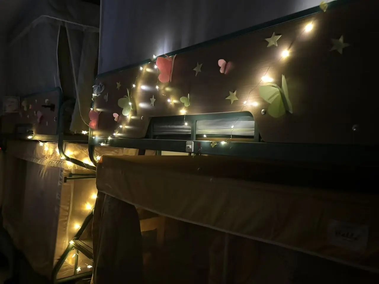 我们的寝室以深蓝窗帘打底,用暖色灯带和星星灯串营造温馨氛围。天花板悬挂着五星红旗,墙面点缀了日历挂件和照片装饰。整体布置整洁有序,既体现了青春活力,又融入了家国情怀,让这里成为充满温度与归属感的小天地。