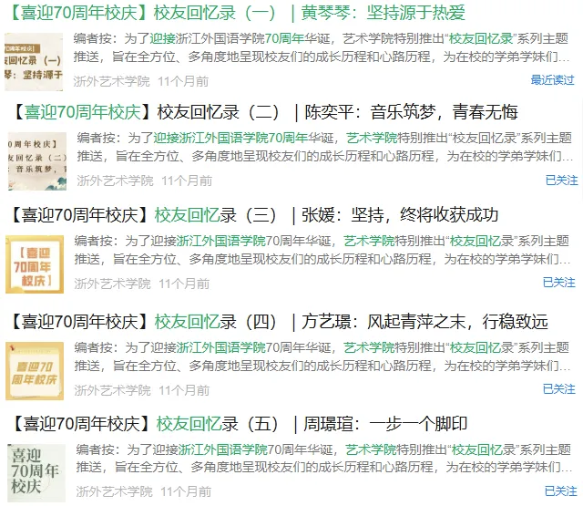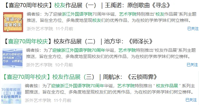 学院官方公众号精心策划并持续更新“校友回忆录”“校友作品展”等专栏,旨在沉淀时光,串联情谊。一篇篇真挚的投稿,娓娓道来校友们的成长足迹与心路历程。专栏已累计发布十三期,它如同一部正在书写的浙外人口述史,为在校师生提供了宝贵的精神滋养。校友作品集专栏,由校友们借助专业创作,以绘画、作曲等形式传递他们对母校的祝福。