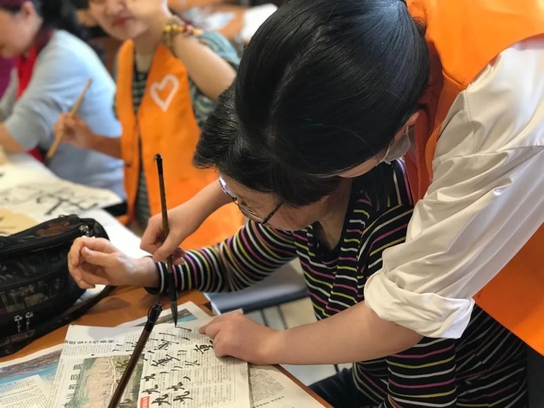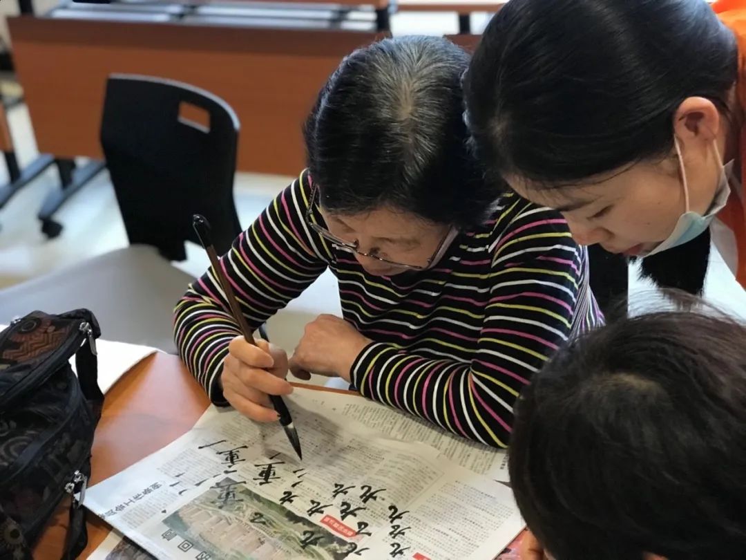 老年朋友在志愿者的帮助下,愉快的练习着书法。