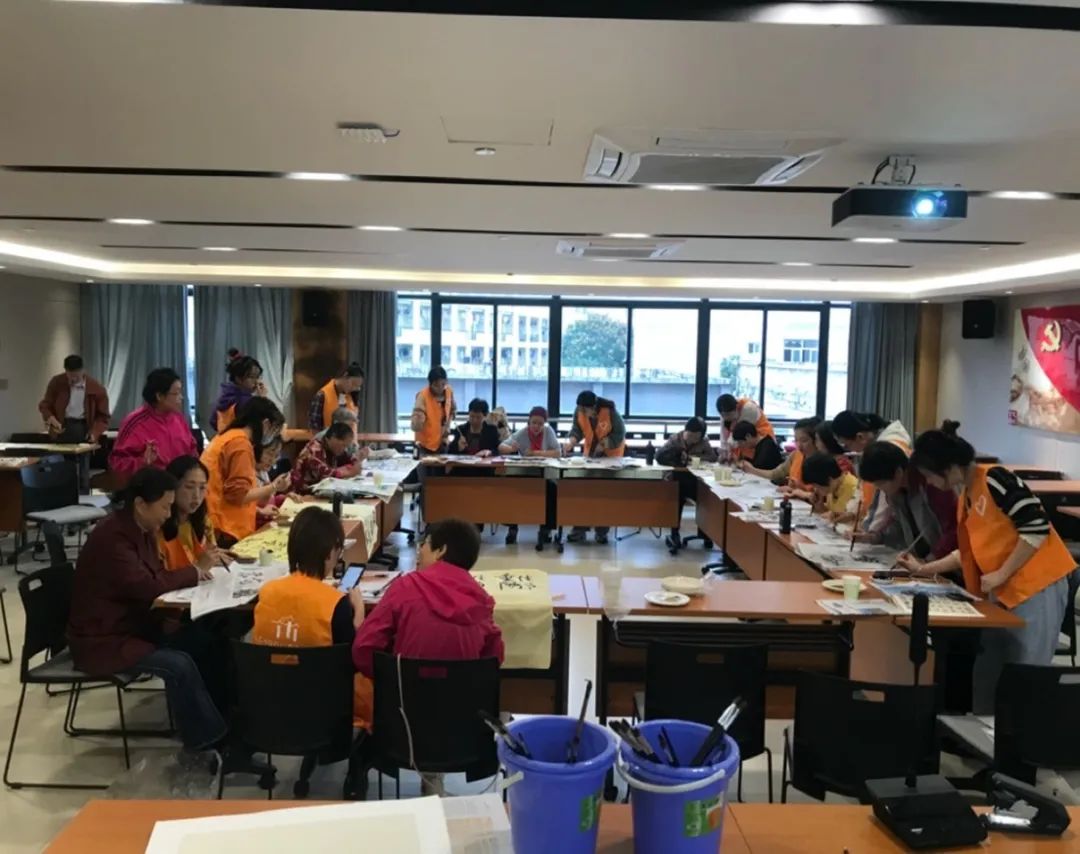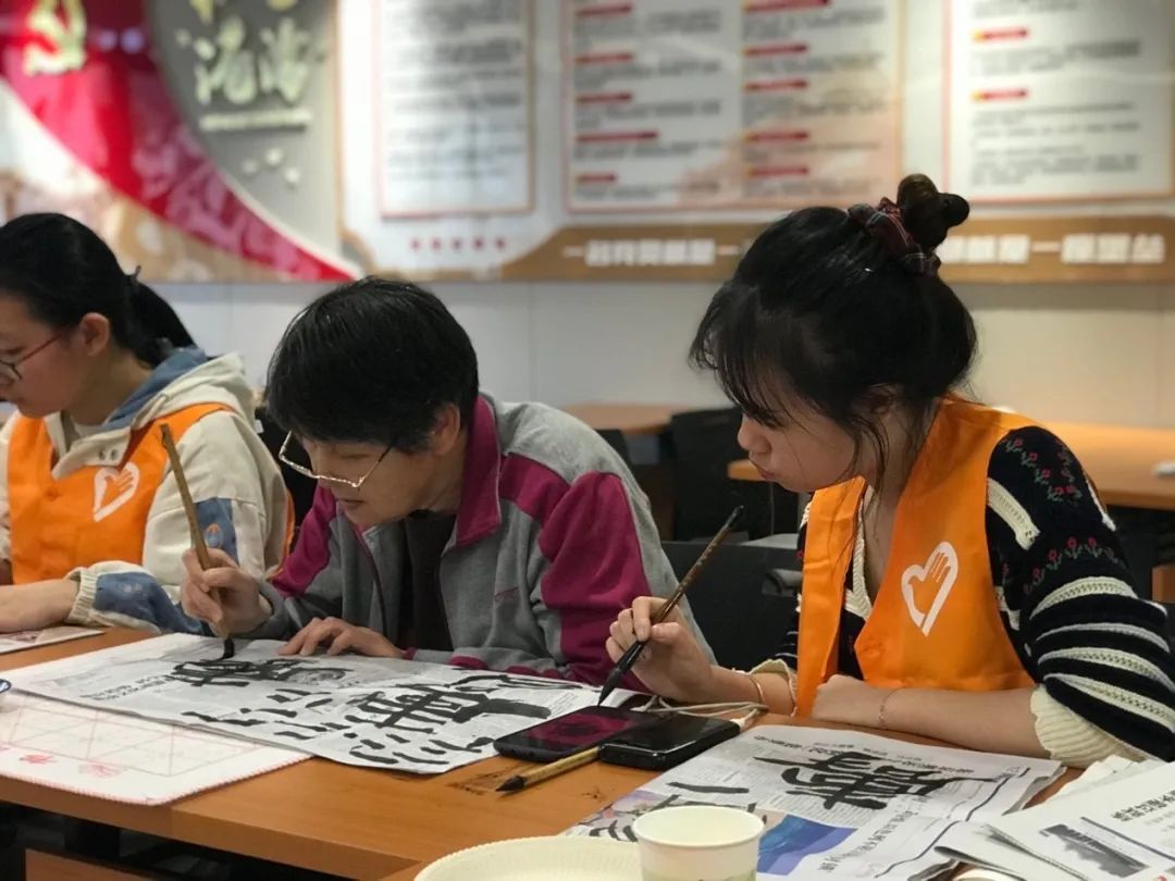 学生志愿者团队来到翰墨香林社区,与翰墨香林社区共同举办了以“挥毫泼墨,品茗观澜”为主题的创意软笔书法比赛活动。
