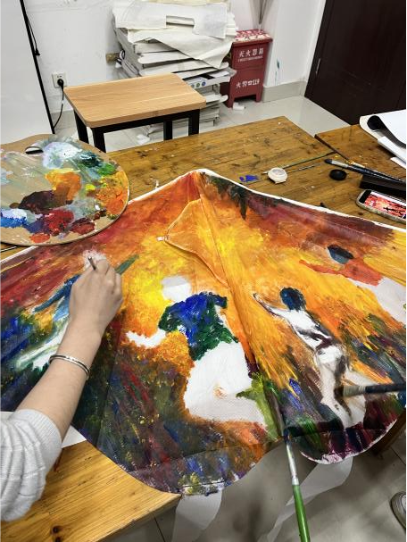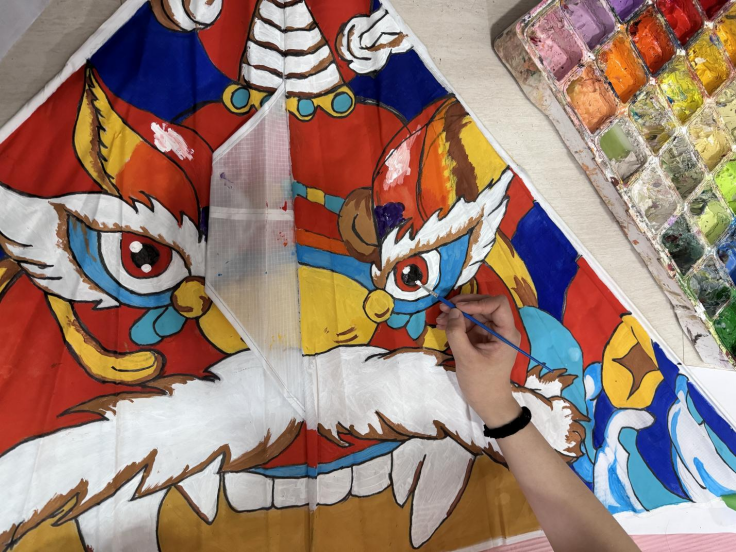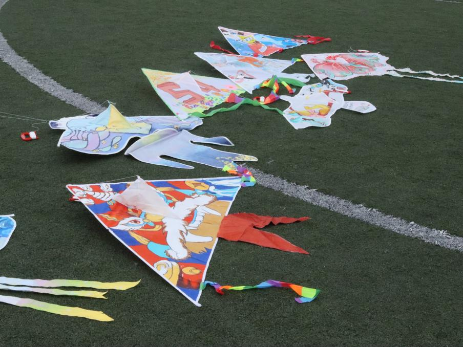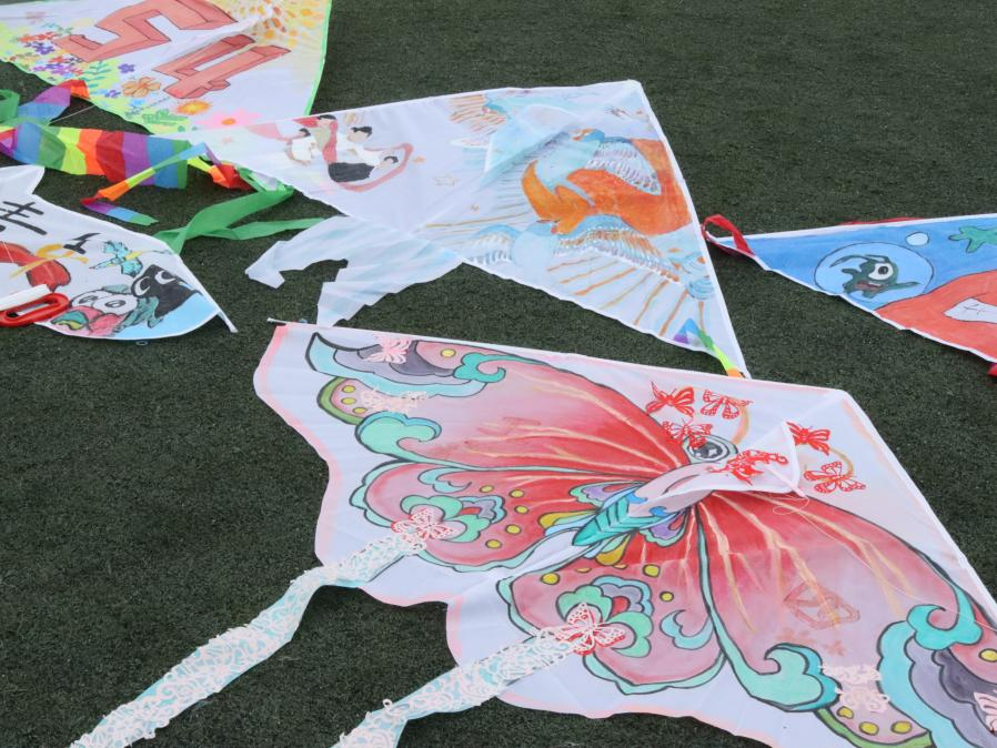 同学们以小组为单位,发挥创意,运用巧思在风筝上使用了剪纸、油画颜料、水彩颜料、马克笔、贴纸等进行美化,让每一个风筝都与众不同且富有力量。