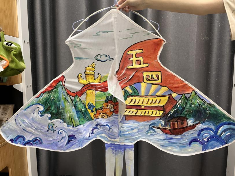 我们组设计感想是我们这次致敬的是五四青年,他们是一批拥有积极的行动能力和革命精神的人,他们不惧艰难,积极参与革命,我们这次选的是一个金鱼图案的风筝,在绘画过程中,我们一直在思考怎么样可以把他们的精神准确且最大化的表现,于是我们大胆开工,将金鱼尾巴进行裁剪。画面中有丰富的元素:华表、天安门,还有象征着中国共产党的精神谱系的红船、朵朵向党的花朵也象征着新青年向党靠拢、大山表现了“绿水青山就是金山银山”的理念,在巨浪中前行的红船,鼓舞着我们青年要“乘风破浪潮头立,扬帆起航正当时”。