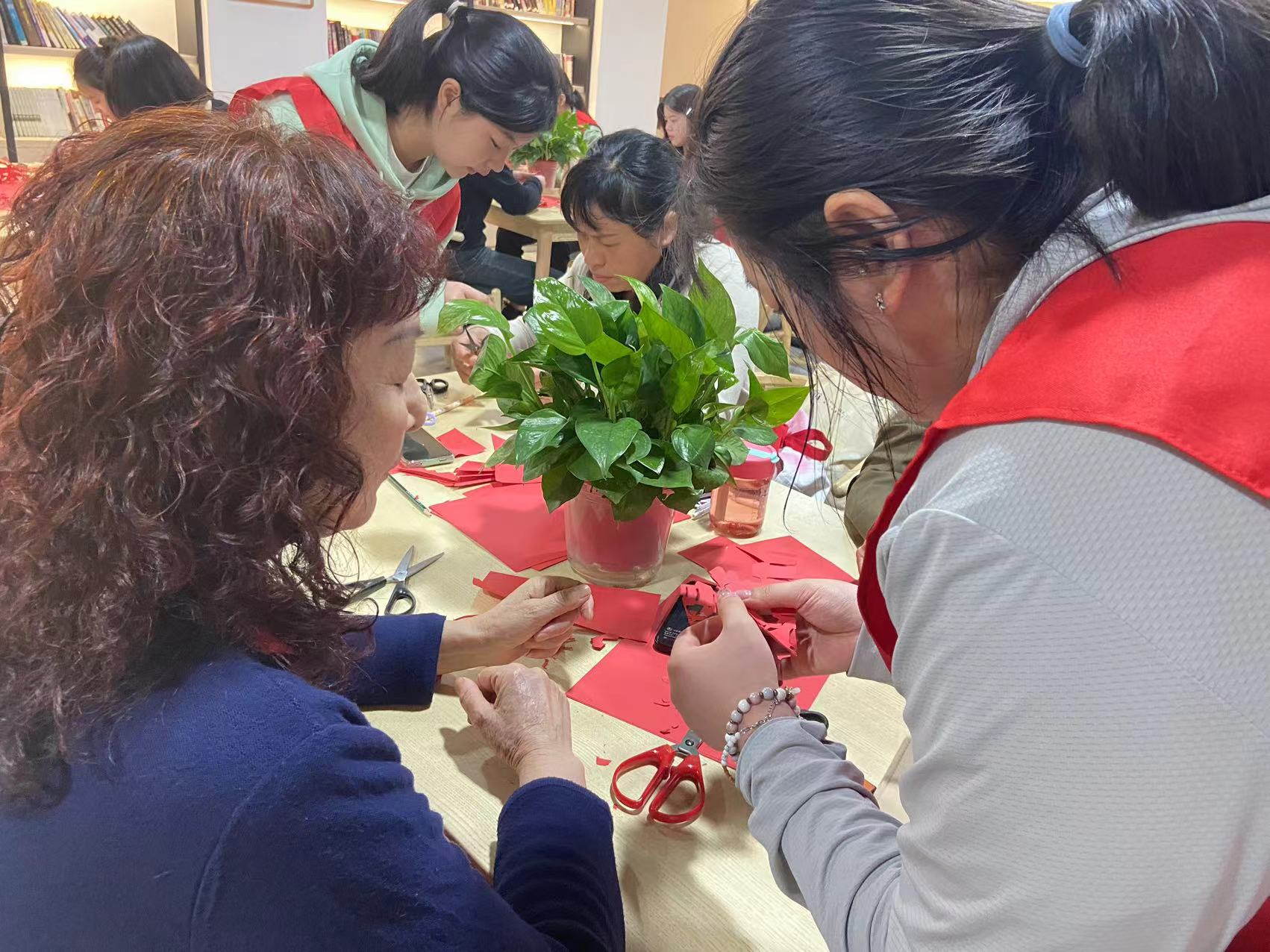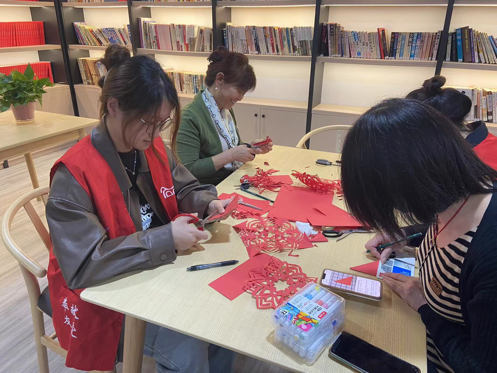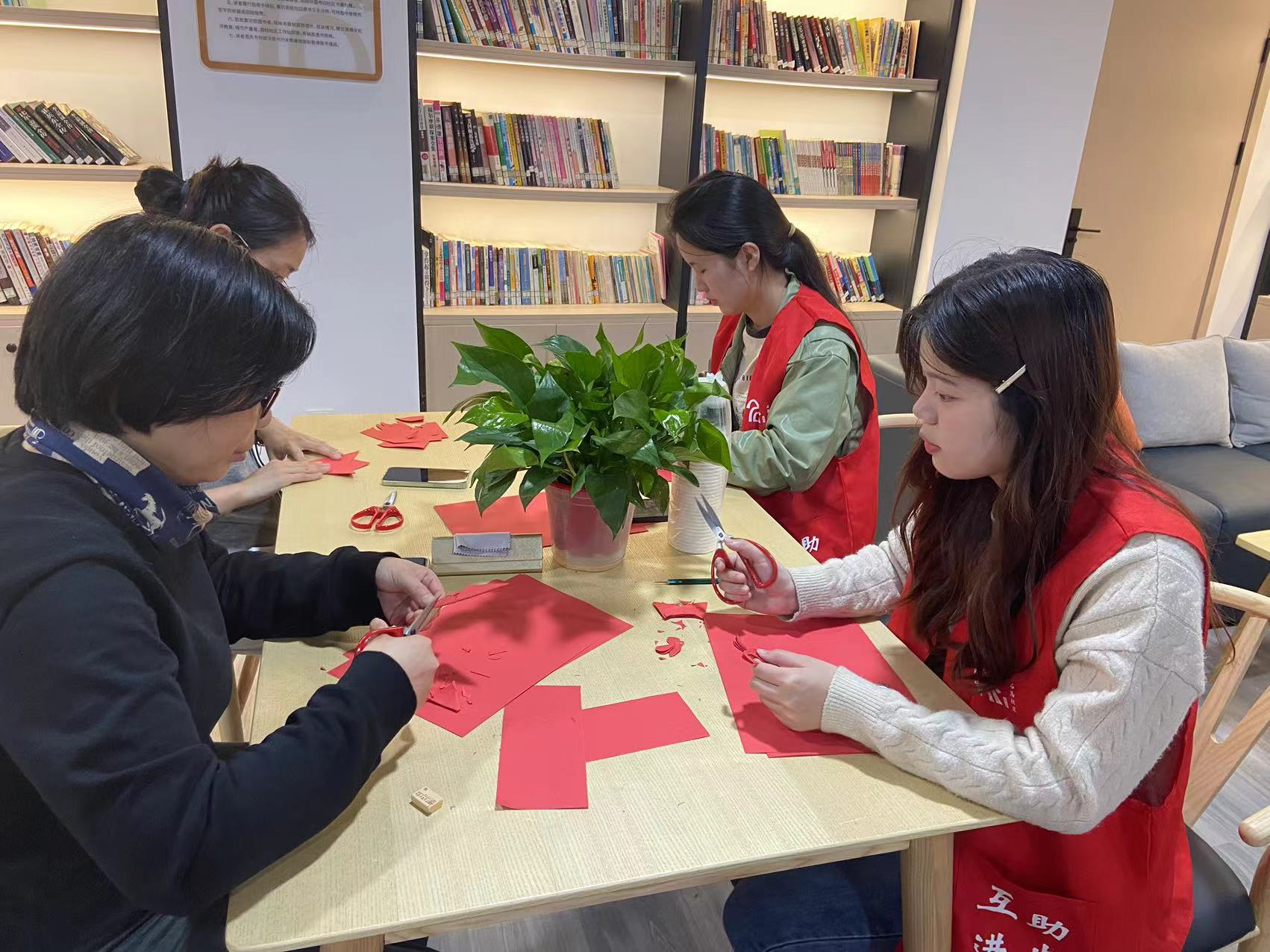 同学们积极响应,来到石马社区民生综合体,与杭州留下街道石马社区的居民们共同完成了这场剪纸活动。活动现场,社区工作人员与学生志愿者精心布置了剪纸工作区,准备了丰富多样的剪纸材料和工具。随着活动的开展,一张张红纸在手下生花。一把剪刀,一张纸,千剪不断,线线相连,中国传统文化在心灵手巧间细腻地刻画显现,祝福与祈盼化成这纸间的风采。