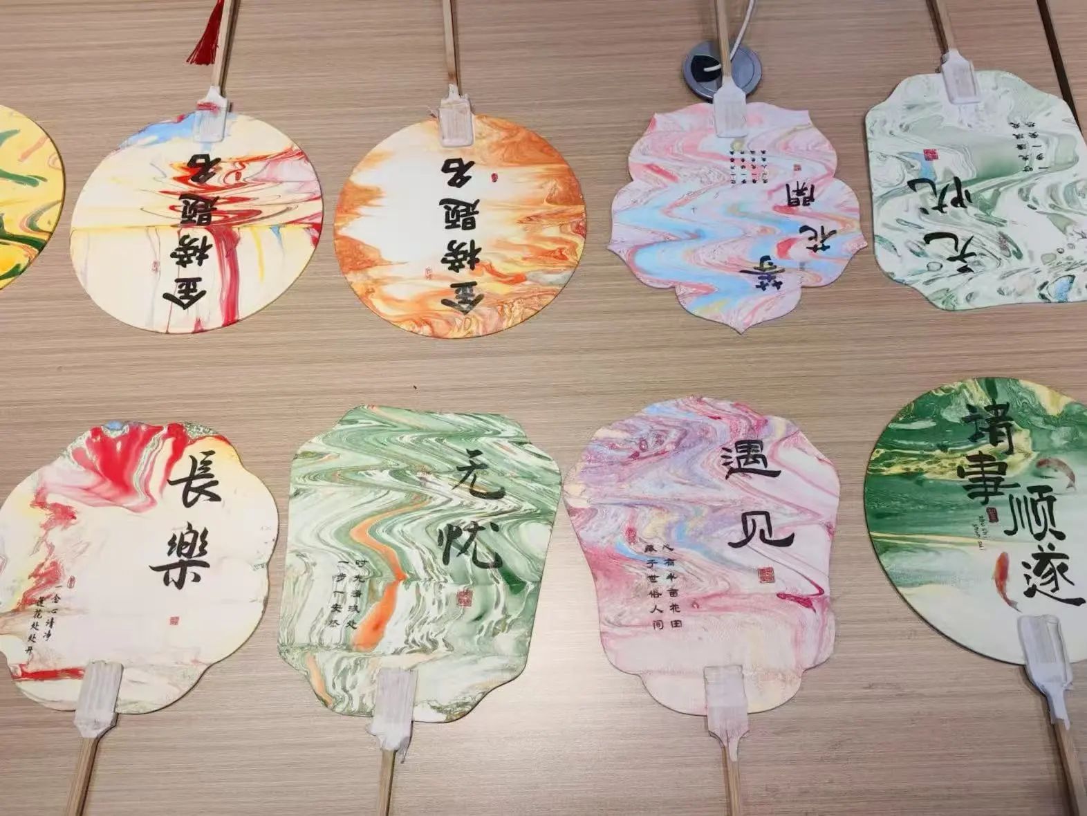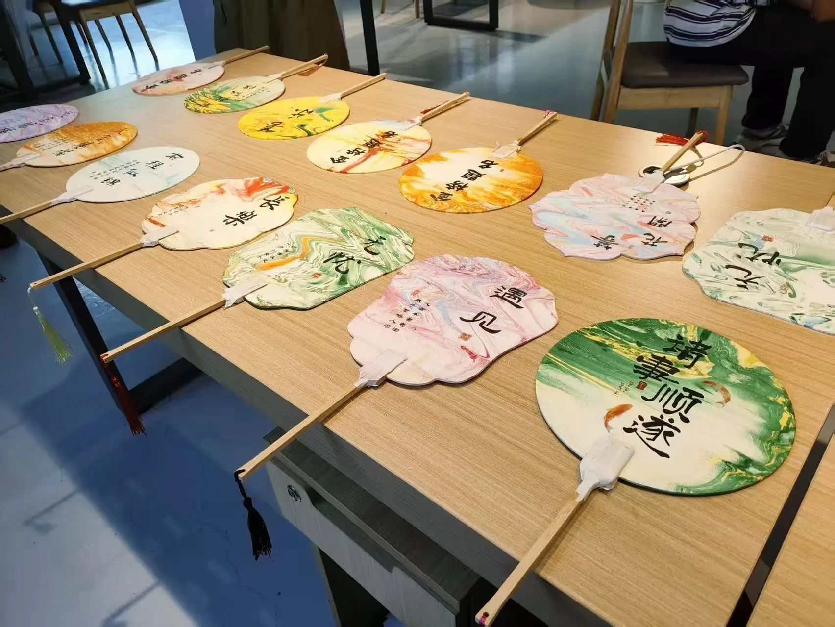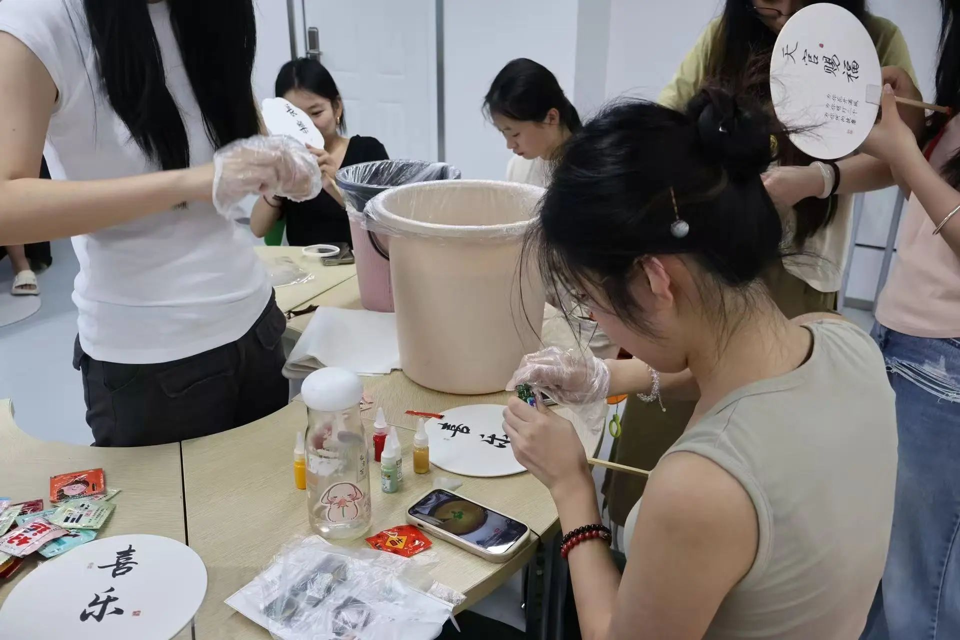 同时,另一小组正在进行着五彩缤纷的漆扇制作。洁白的扇面宛如一方等待泼墨的宣纸,承载着大家对传统艺术的敬意与创作热情。