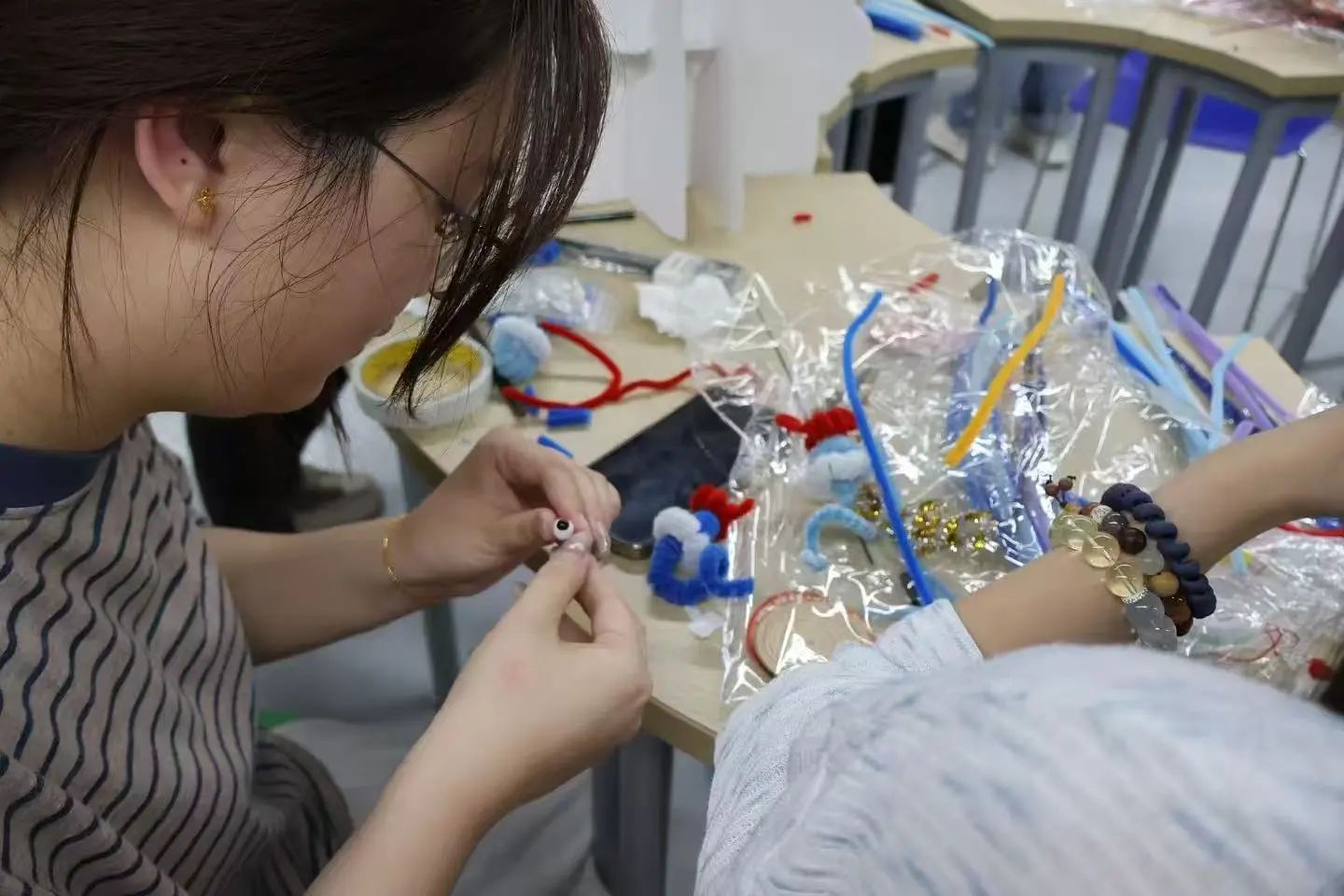 活动伊始,色彩斑斓的扭扭棒被有序分发到师生手中。由两名同学进行教学,在大家灵动的指尖下,扭扭棒渐渐有了形状。师生们全神贯注,运用弯曲、缠绕、拼接等技巧,精心塑造着小蛇的身体、头部和眼睛,老师们也兴致勃勃地参与其中,一边耐心学习制作技巧,一边与同学们亲切交流创意想法,现场气氛热烈而欢快,充满了童真与创意的气息。