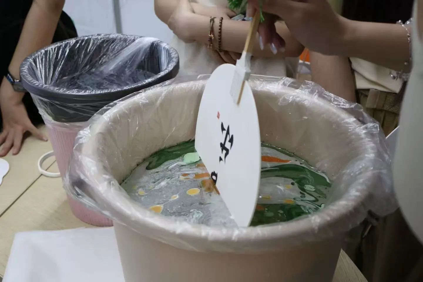 首先大家细心地将扇柄贴上胶带,防止染色。接着大家根据个人喜好,精心调配颜料,将不同颜色的漆滴入水中搅拌。有的以传统山水为蓝本,用白色和蓝色将大自然的美妙浓缩于扇面之上;有的则将现代艺术元素巧妙融入其中,用抽象的图案和大胆的色彩,展现出独特的艺术视角,让古老的漆扇焕发出全新的现代魅力。