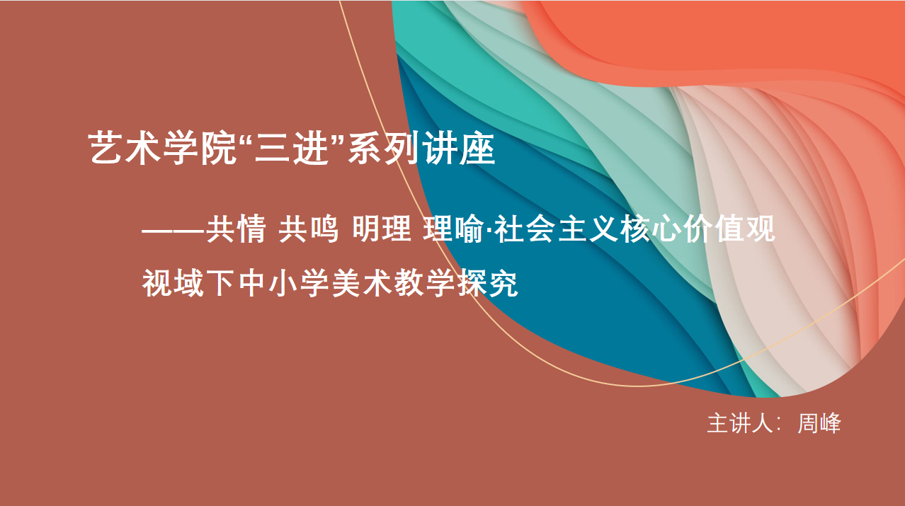 “三进”系列讲座之《共情 共鸣 明理 理喻——社会主义核心价值观视域下中小学美术教学探究》。本次讲座由杭州市西溪中学艺术教研组长、西湖区优秀教师、西湖区学科带头人周峰老师主讲。