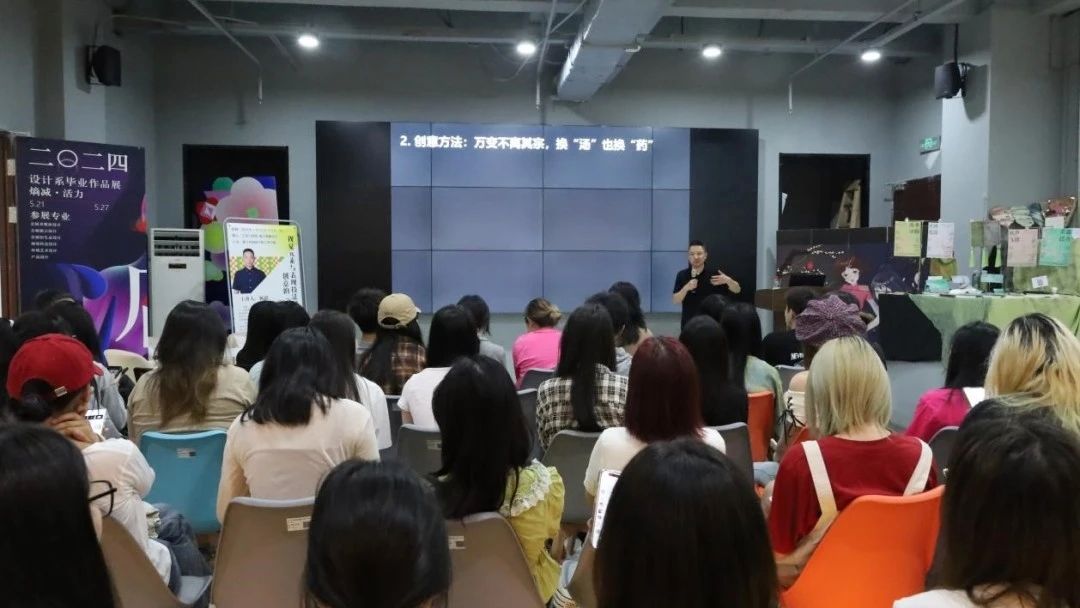 师生共计70余人参加。杨超教授以其丰富的经验和独到的见解,深入剖析了视觉元素与表现技法在创意设计中的重要作用,并分享了如何将“温度”与“锐度”融入设计之中,使作品更具感染力和冲击力。